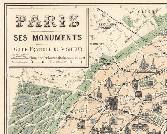 Vintage PARIS Monuments map 1924 Borremans - Eiffel Tower, Notre Dame