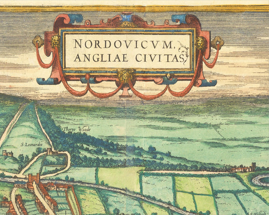 Old Norwich Map 1581 by Braun - Nordovicum Norwich Castle Cathedral