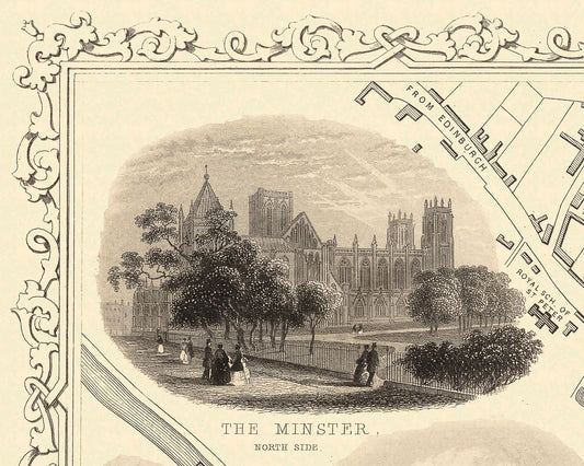 YORK Map 1851 John Tallis - York Minster Cliffords Tower River Ouse