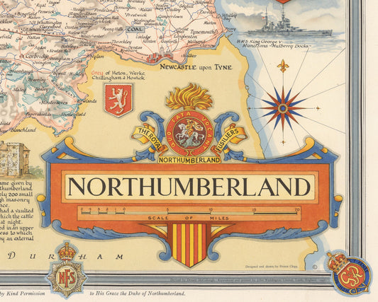 Vintage NORTHUMBERLAND Map, 1946, Ernest Clegg, Morpeth Hexham
