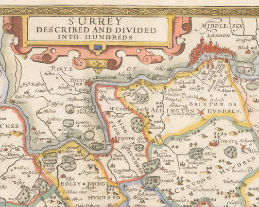 SURREY Old Map by John Speed 1676 Woking Guildford Richmond Croydon
