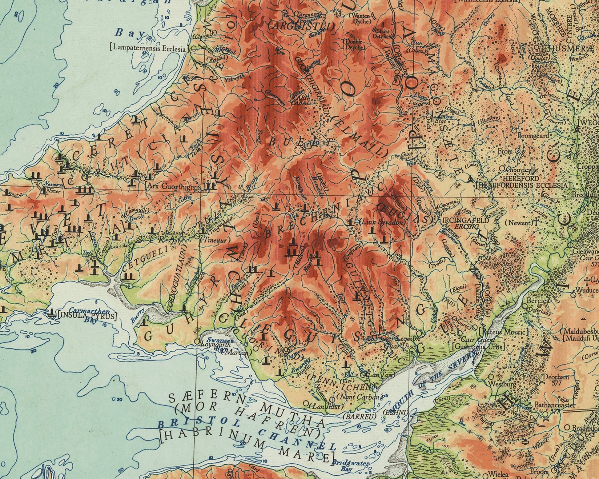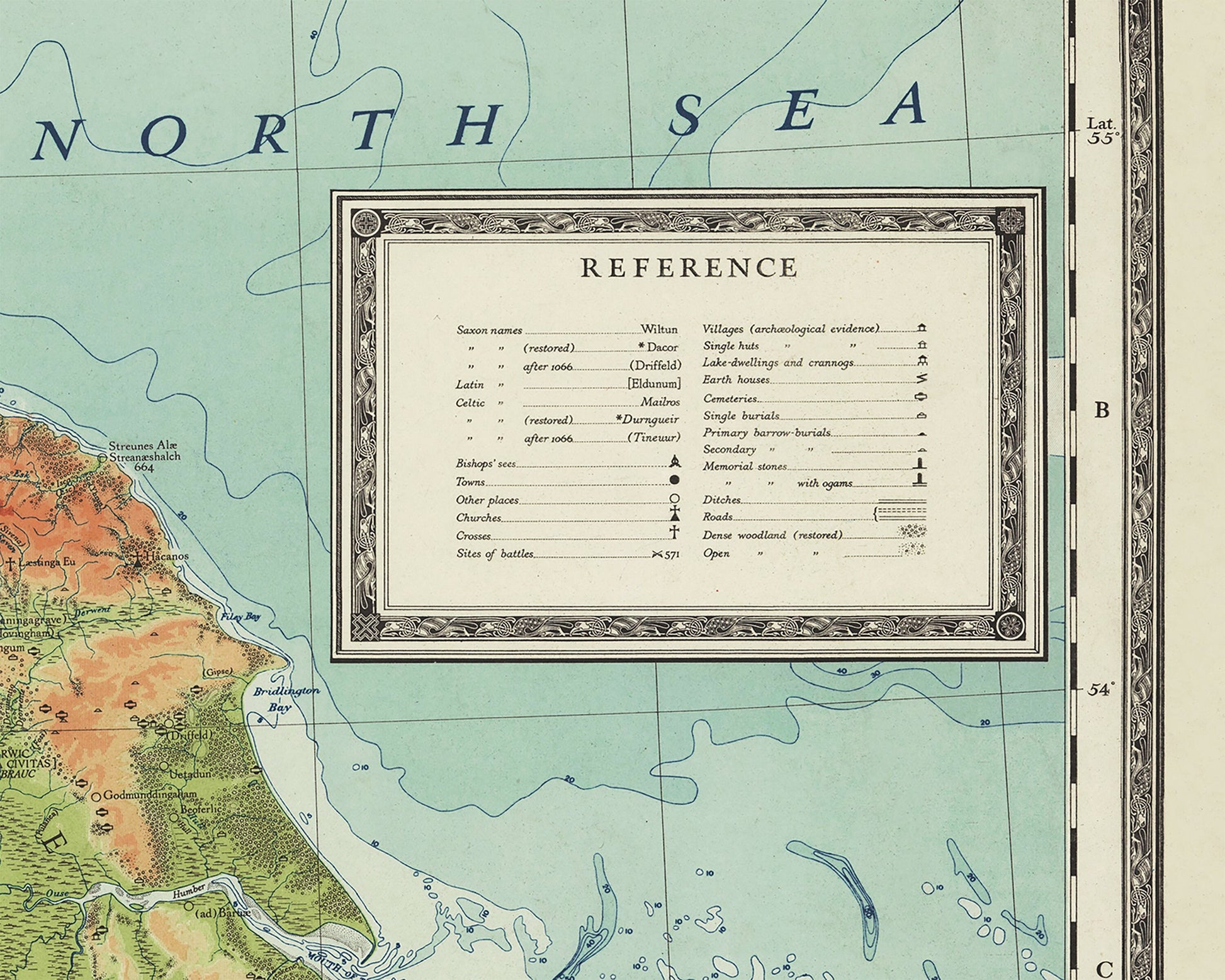 The entries on the map are derived from both archaeological and historical sources, and an attempt has been made to represent adequately both the Celtic and the Saxon aspects of the period. It is believed this is the first time such a complete picture of the Dark Ages has been represented on a map of Britain.