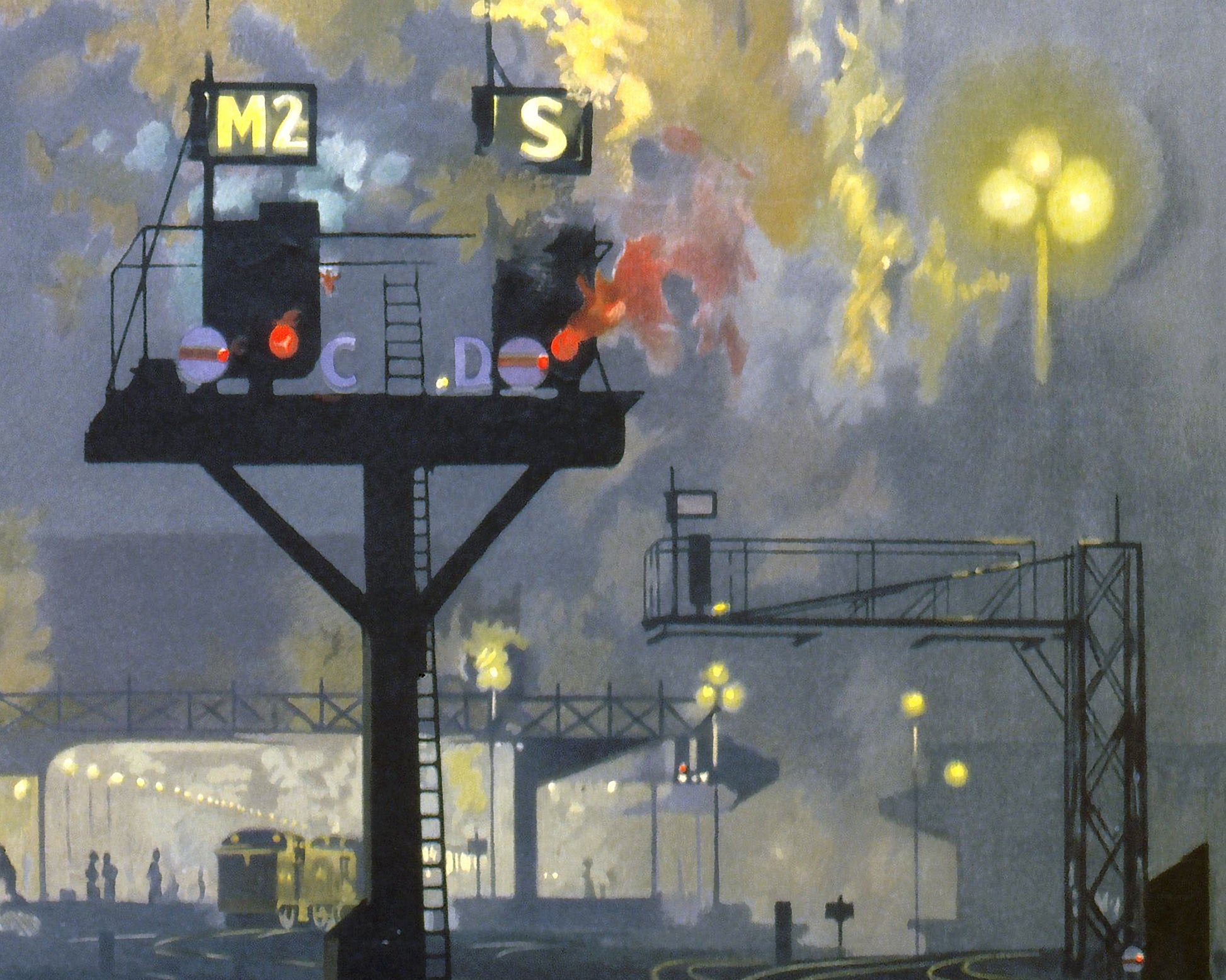 This is our reworking of the classic print by David Shephard 'Service by Night' commissioned by British Railways. Completed in 1955 this work depicts a train leaving King's Cross station at night, passing signal gantries set against a smoky and cloudy sky.
