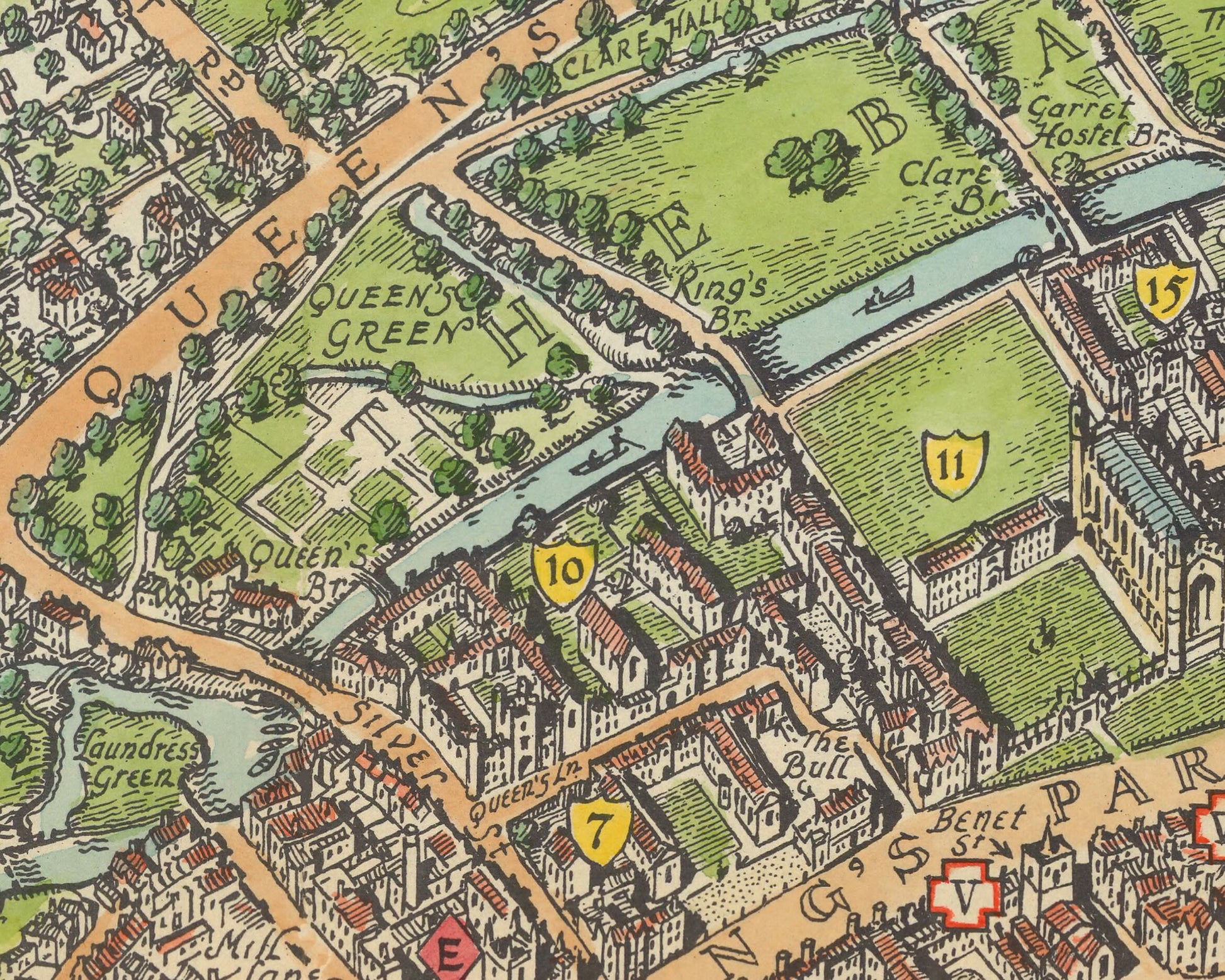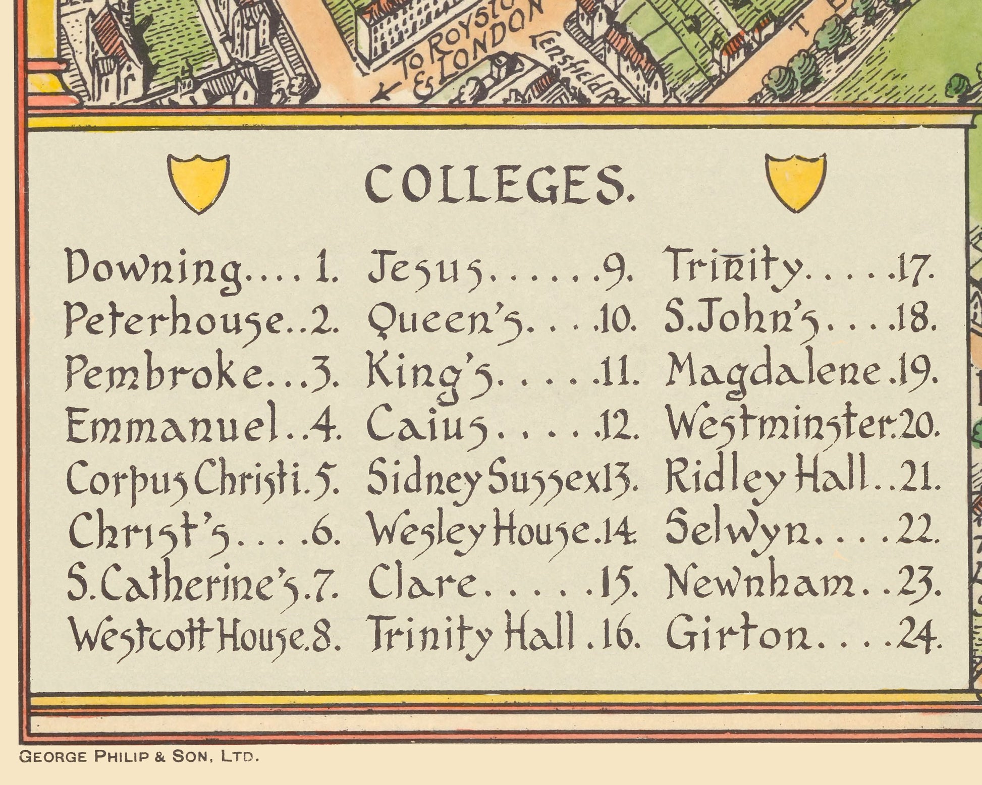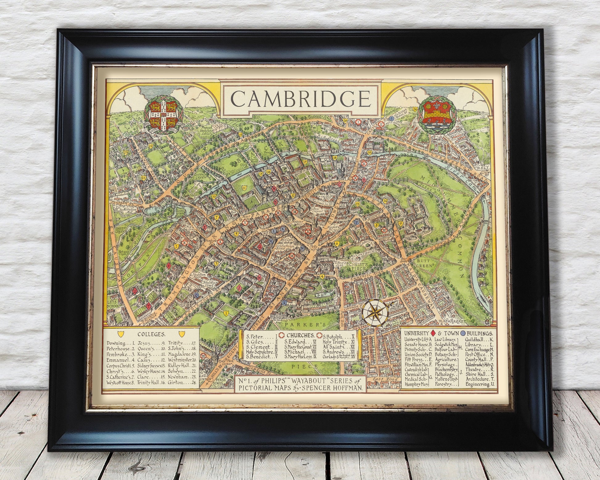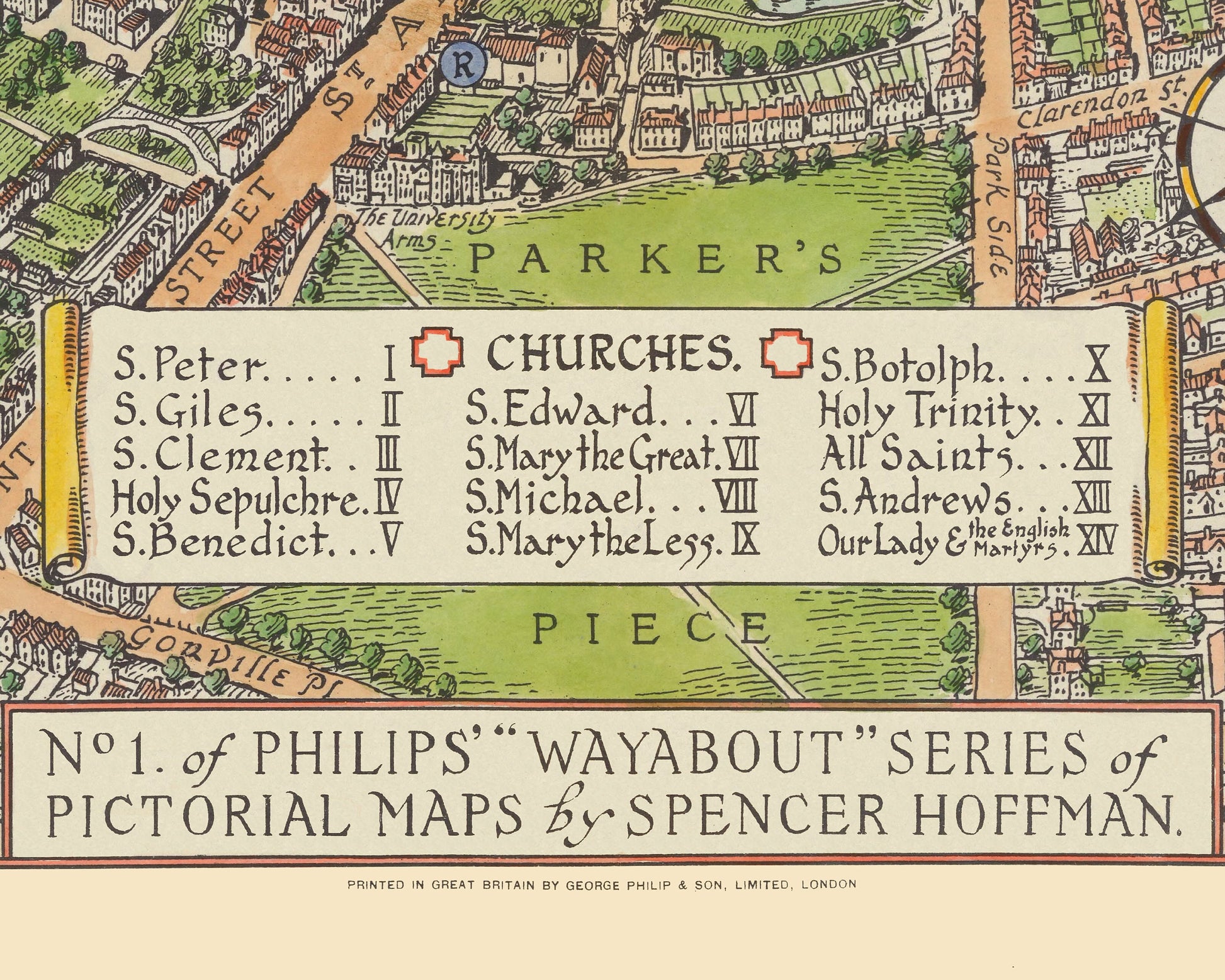 This charming map of Cambridge (No 1 of Philips' "Wayabout" Series) was created by Spencer Hoffman in 1930 in a striking pictorial style.