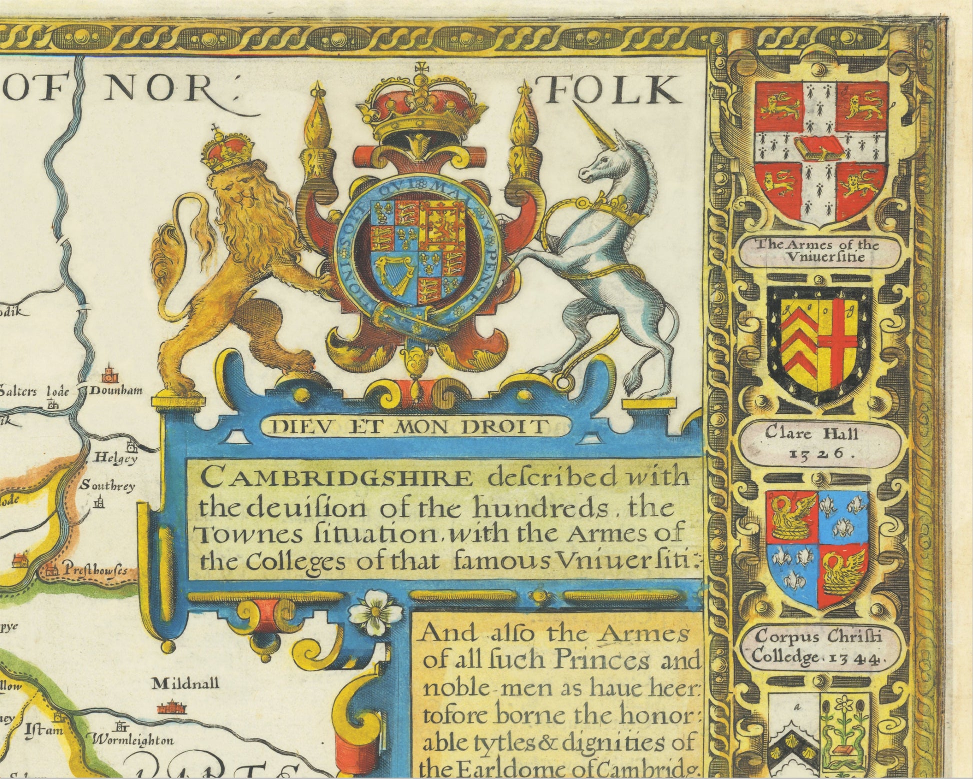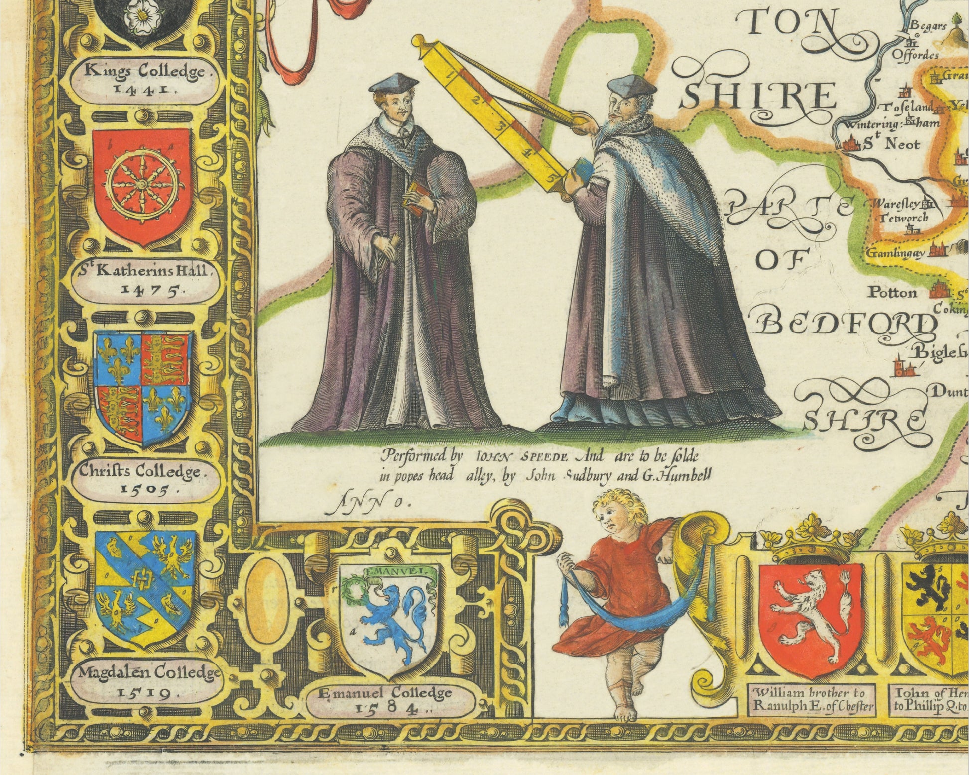 The Cambridgeshire map was one of Speed's most elaborate works and consequently it was one of the longest to produce. It features 15 separate coats of arms for the various colleges that made up the University of Cambridge. It also depicts four characters each dressed in academic robes and one utilizing a pair of measuring dividers. The attention to detail is quite something to behold. Obviously the county town and University town of Cambridge features prominently throughout the work.