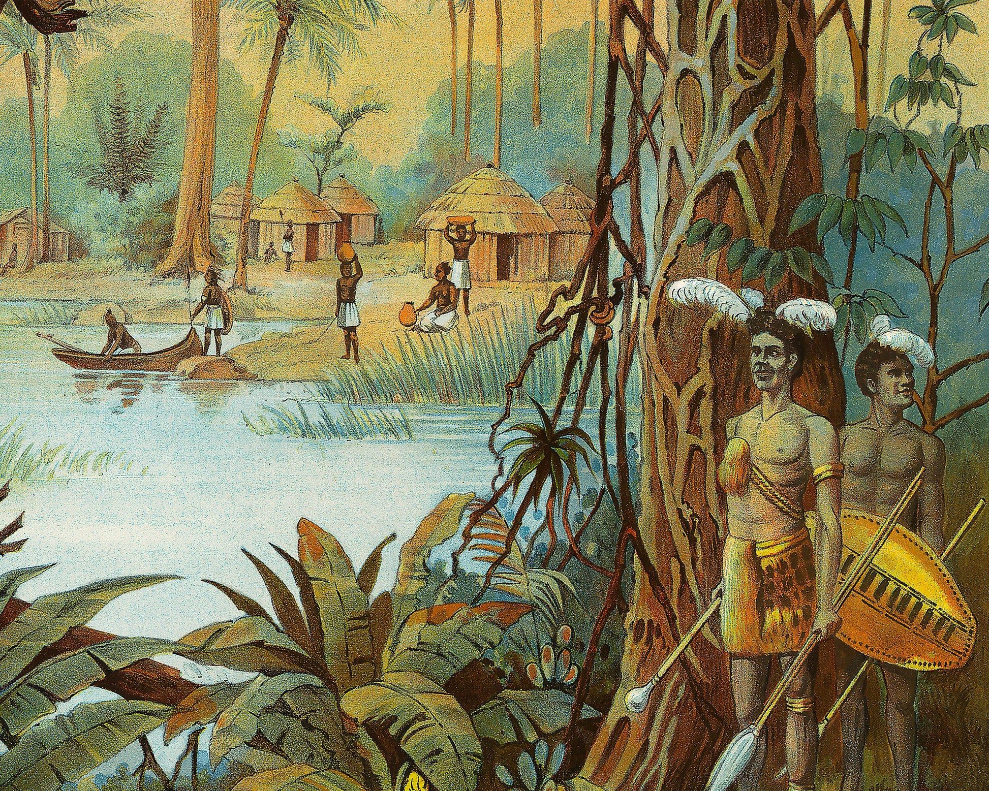 Yaggy's large geographical charts are among the most beautiful and impressive educational charts published in the 19th century. Using chromolithography, Yaggy created stunning colours and contrasts in his images of the world, its regions, and peoples. This Tropical Zone scene was one of 10 such geographical works. Yaggy's depiction of the Tropical Zone is lush and active, with an abundance of ferns, palms, vines, and water born grasses, that give way to animals such as snakes, jaguars, and monkeys. Several distinct types of people indigenous to the tropical zone are also depicted, one pair hunting a jaguar while another looks on holding shields, spears, and a club. Additional natives fill a scene in the background with some carrying baskets atop their heads and others loading into a dugout canoe. Thatched roof huts of various styles serve as examples of the type of dwellings found within the Tropical Zone during the late 19th century and still today.