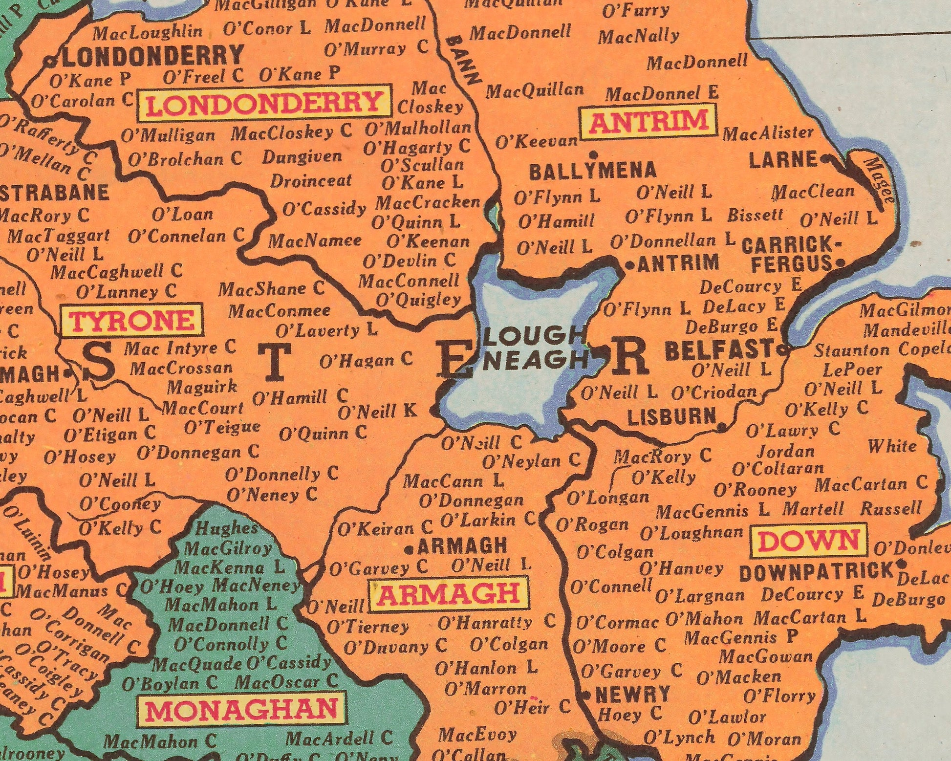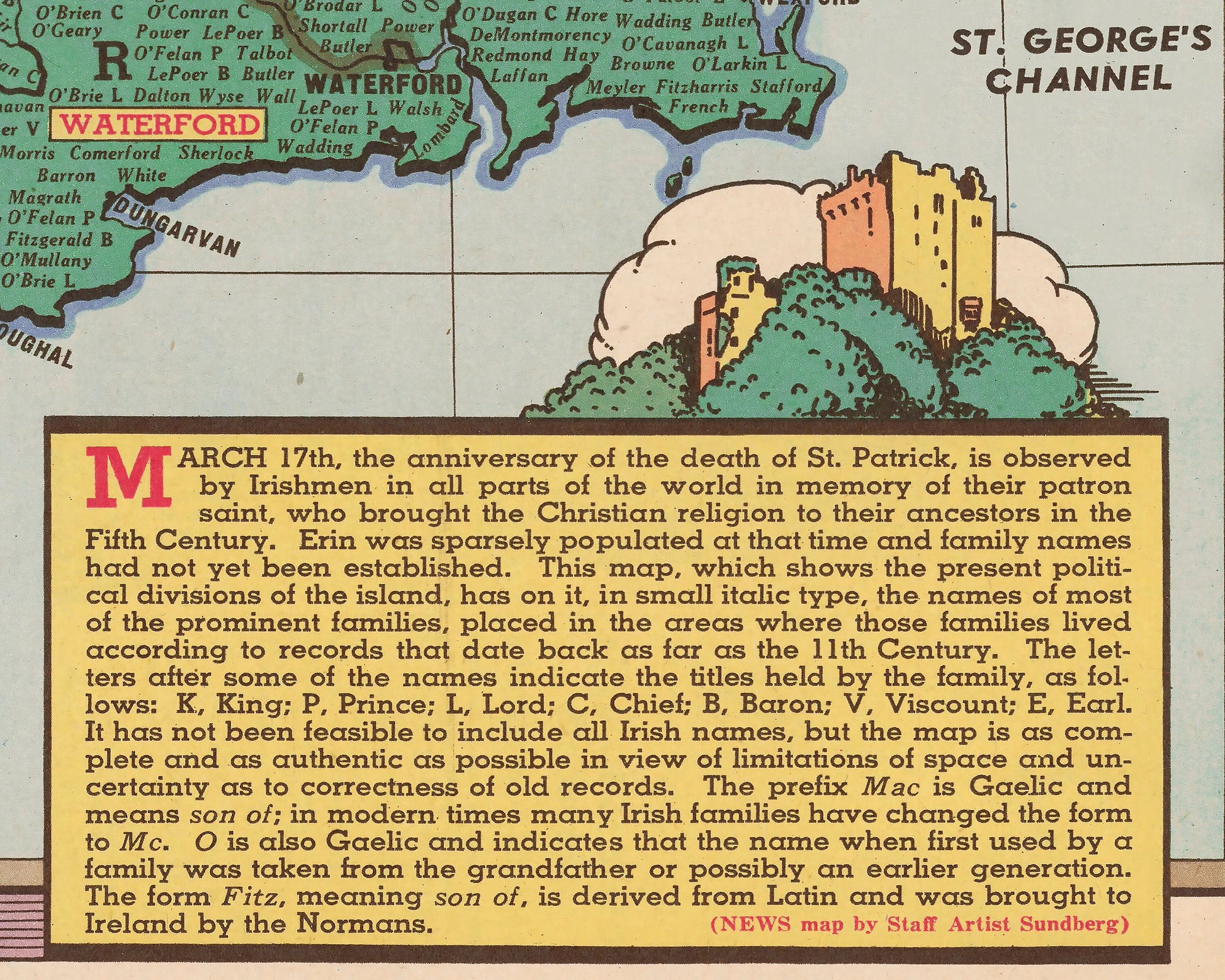 This superb map was published in the Sunday News 17th Match 1946. It was created by Edwin Sunberg to help New Yorkers of Irish heritage trace their roots back to the Emerald Isle. It delineates all 32 Irish counties, 6 in Northern Ireland and the remaining 26 in the Republic of Ireland. The principle towns and cities of each county are shown in bold font. An extensive collection of surnames such as O'Grady, O'Hanlon, O'Connell, Fitzgerald, MacCarthy, O'Sullivan to name a tiny proportion are then accurately plotted throughout the map. There is a written piece in the bottom right corner giving some interesting facts such as the prefix Mac is Gaelic and means son of whereas the form Fitz again meaning son of is derived from Latin and brought to Irish shores by the Normans.