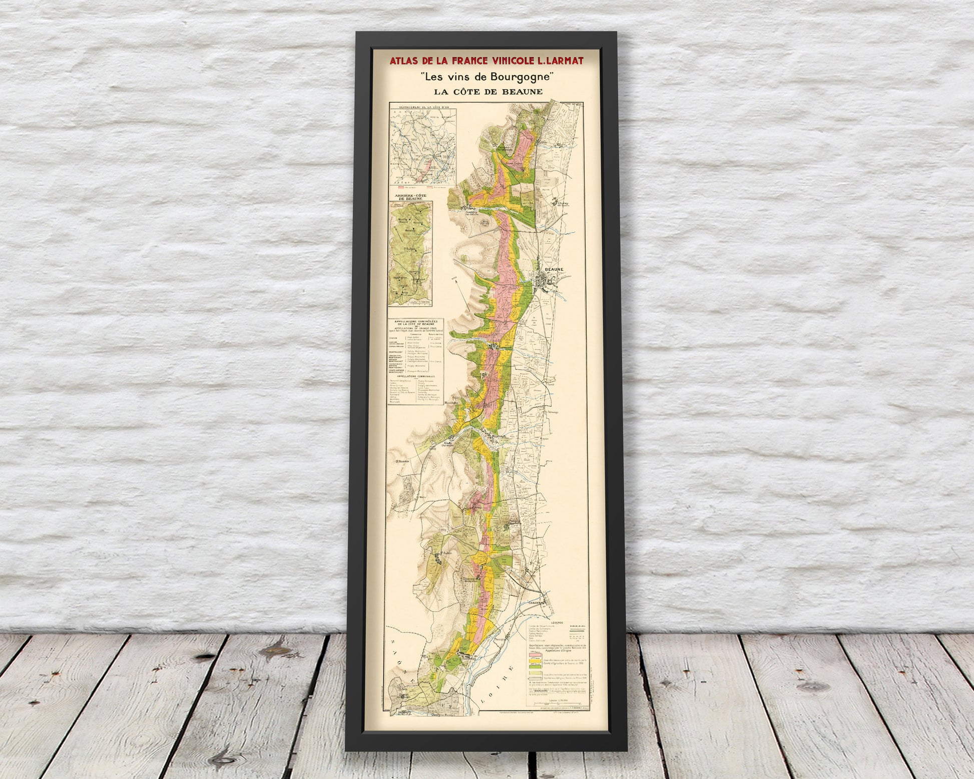 This is an exceptional quality wine map reproduction of the 1942 work produced by famed wine aficionado Louis Larmat. Focussing on the Burgundy wine producing area of La Côte de Beaune in Bourgogne this map features a superb detailed map of the world famed vineyards. It features 2 further inset maps detailing Arriere-Cote de Beaune and Departement de la Cote D'Or.