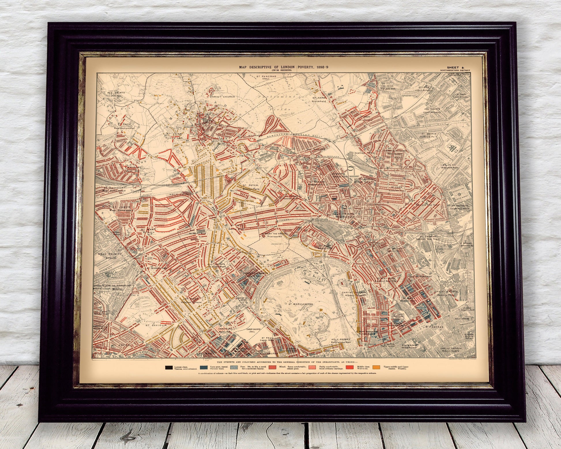 This is an exceptional quality, museum-grade reproduction map which represents an important part of our social history. Social researcher and reformer Charles Booth conducted one of the first surveys to systematically study poverty experienced in the nation's capital. This map - North Western district sheet 4 covering Marylebone, Hampstead, St John's Wood and Kentish Town - was one of twelve such maps produced in this comprehensive survey. View the above picture to see the modern-day equivalent area which this map covered.