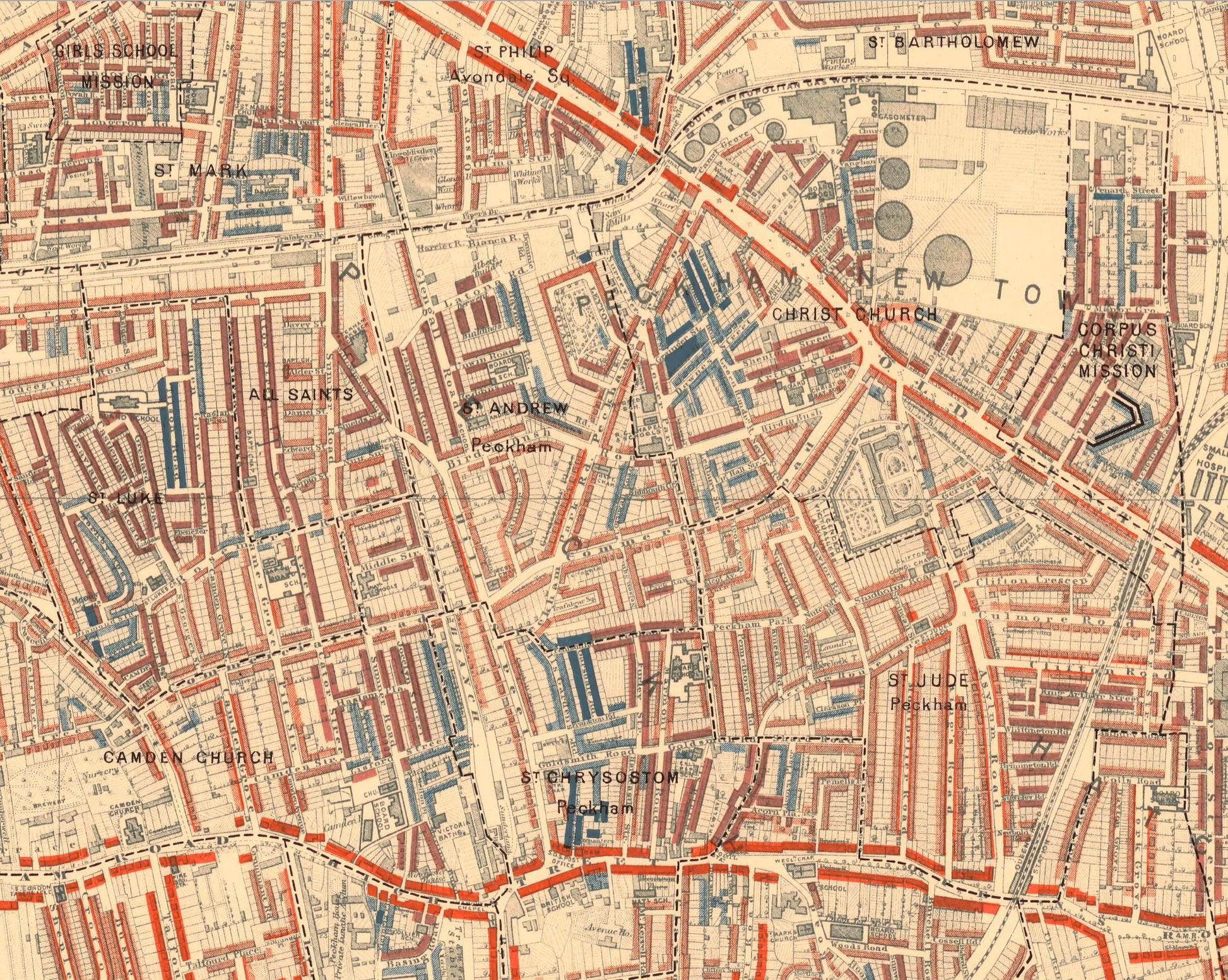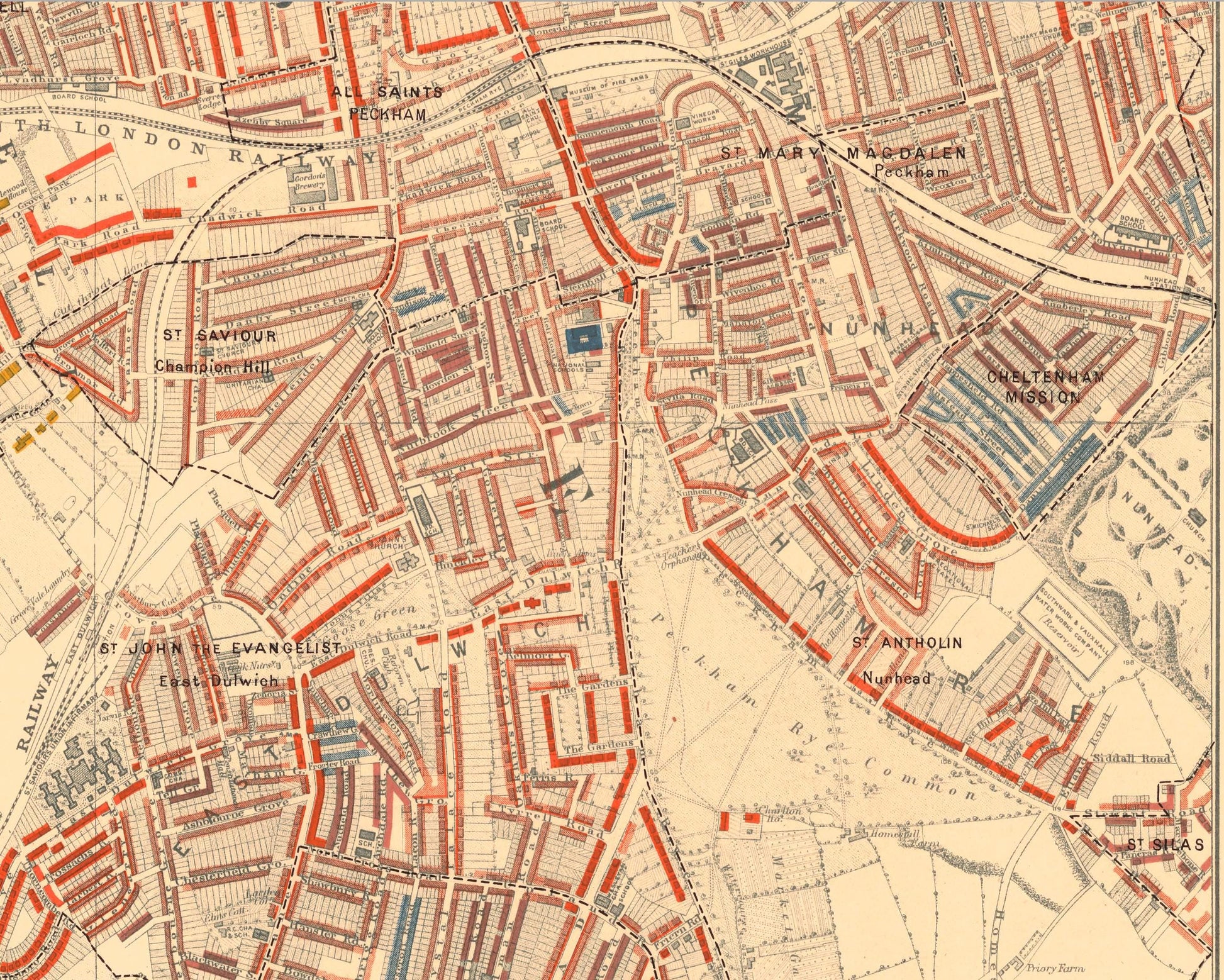 LONDON poverty Map Oval, Brixton, Herne Hill 1898 Charles BOOTH
