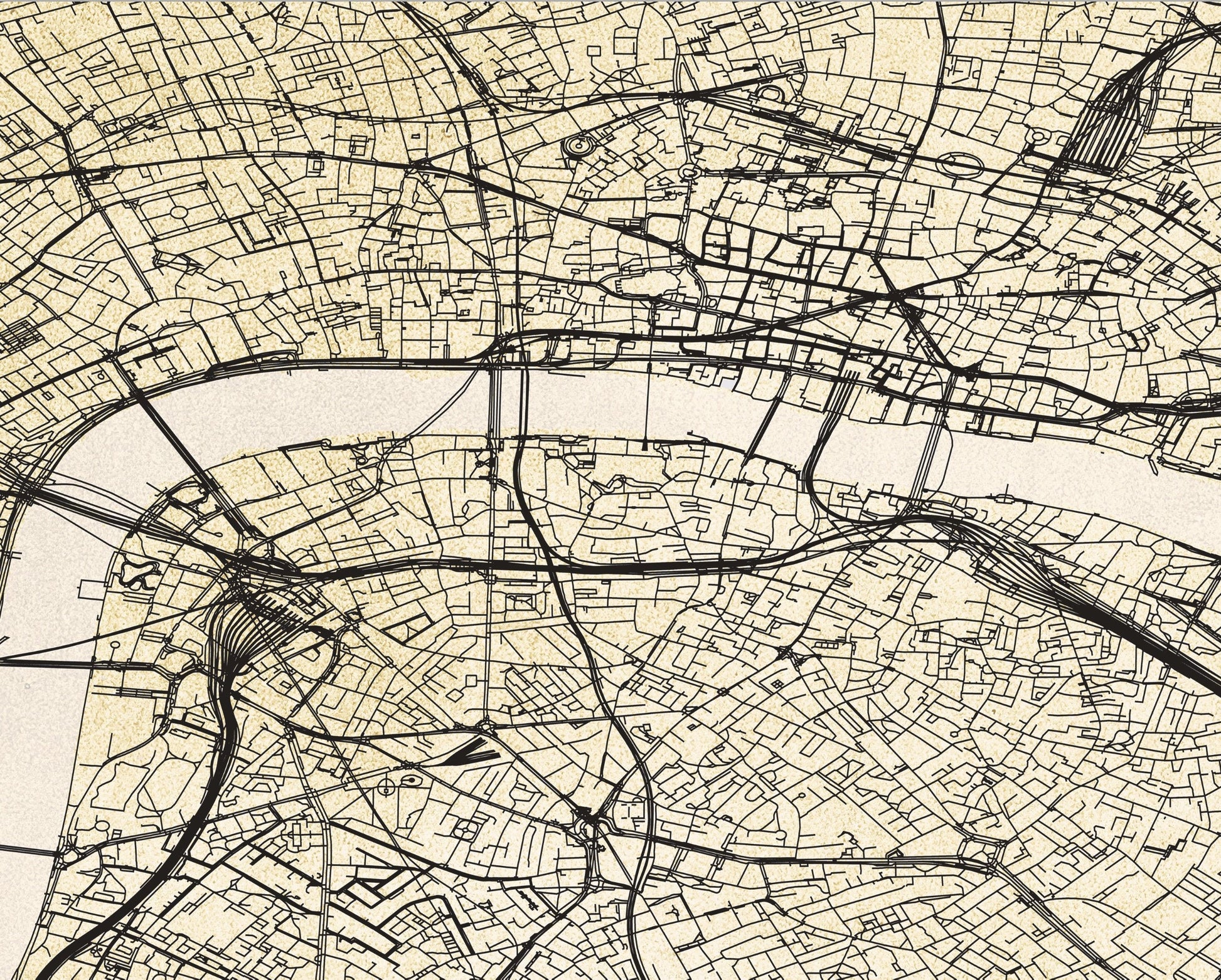 This vintage style map portrays a minimalist view of the roads, railways and waterways of modern day London but sets them onto a classic vintage style paper as the backdrop. It is a perfect symbiotic print of the old and the new lovingly created in our own studio. This charming map is an ideal way to commemorate and celebrate those special sentimental moments form our lives - that wonderful weekend break, a graduation, where we first met or countless other memories.
