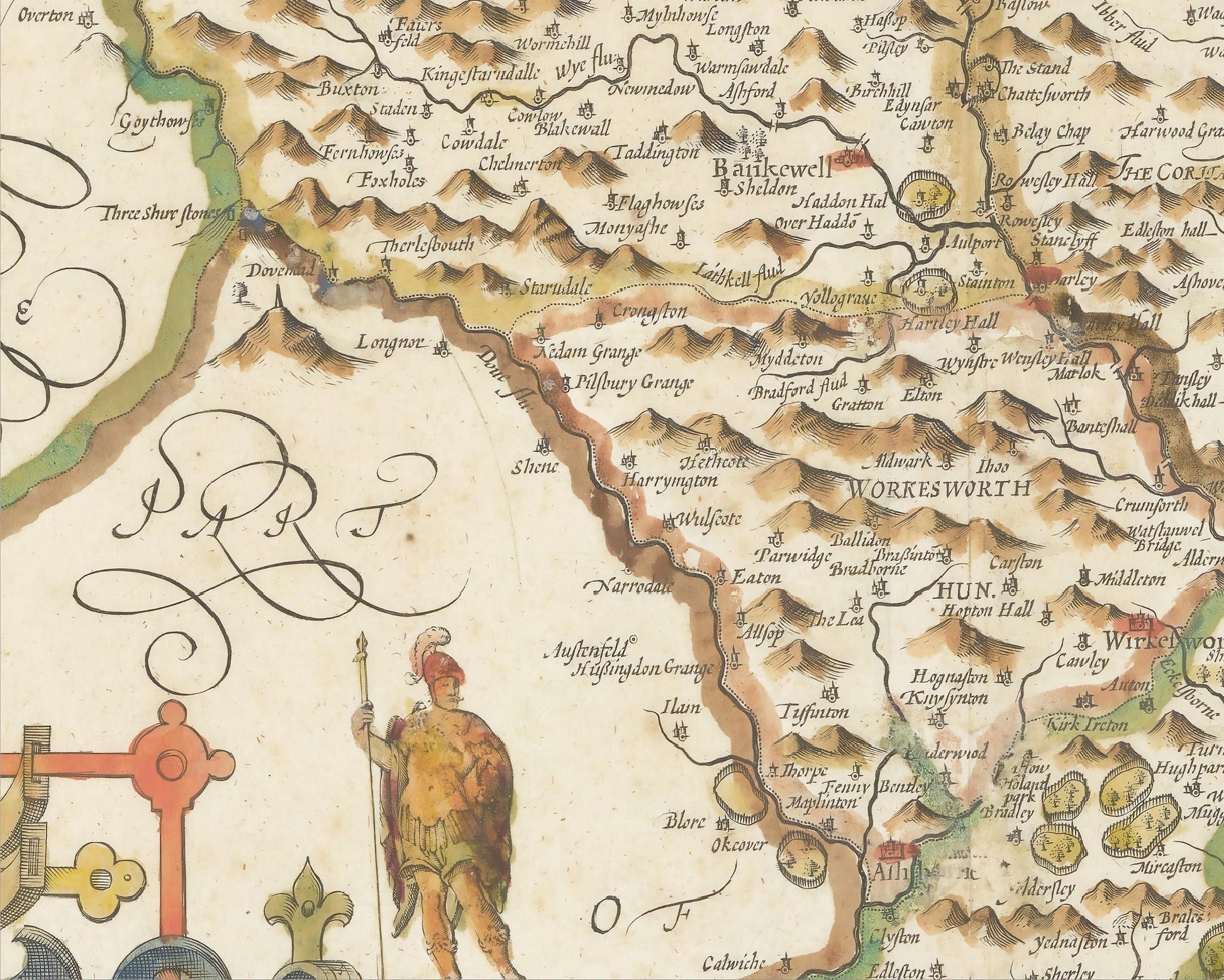 • A visually beautiful stunning and detailed map of 17th century Derbyshire which includes rivers, wooded areas, place names and hill ranges