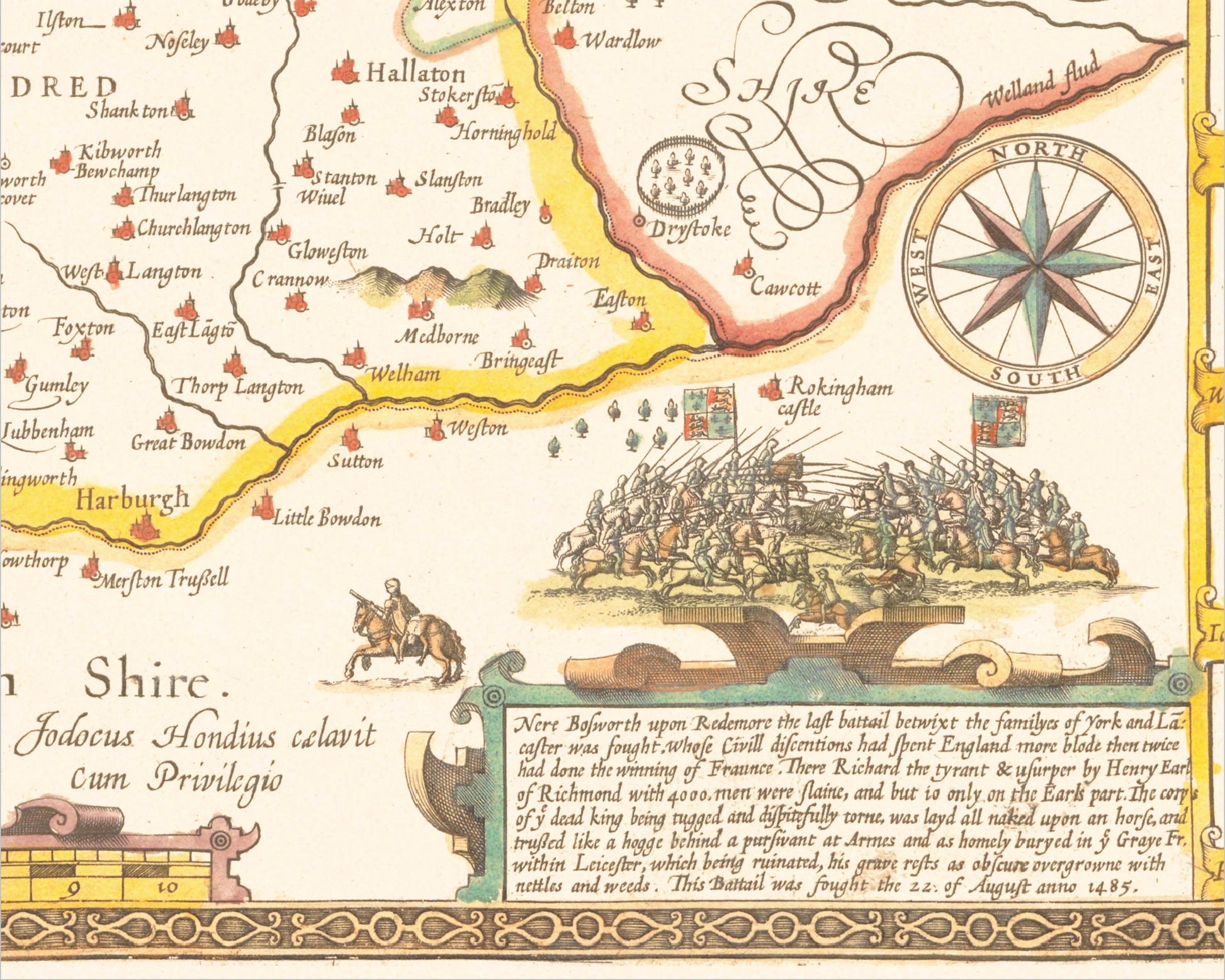• A vignette of the final Battle of the Roses at Bosworth in 1485, complete with a Latin inscription
