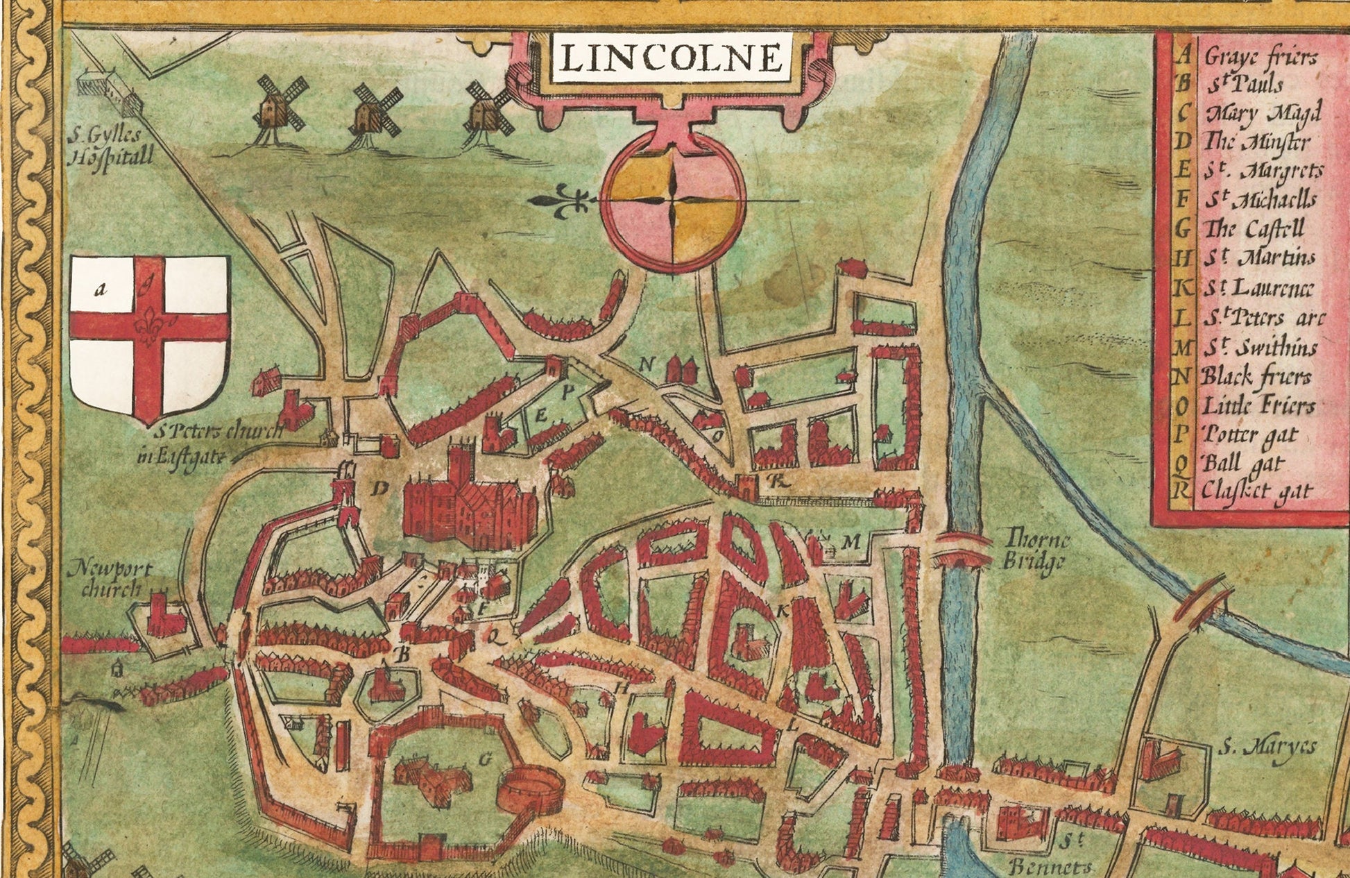 • A plan of the city of Lincoln including a key detailing the many churches and gates (see above)