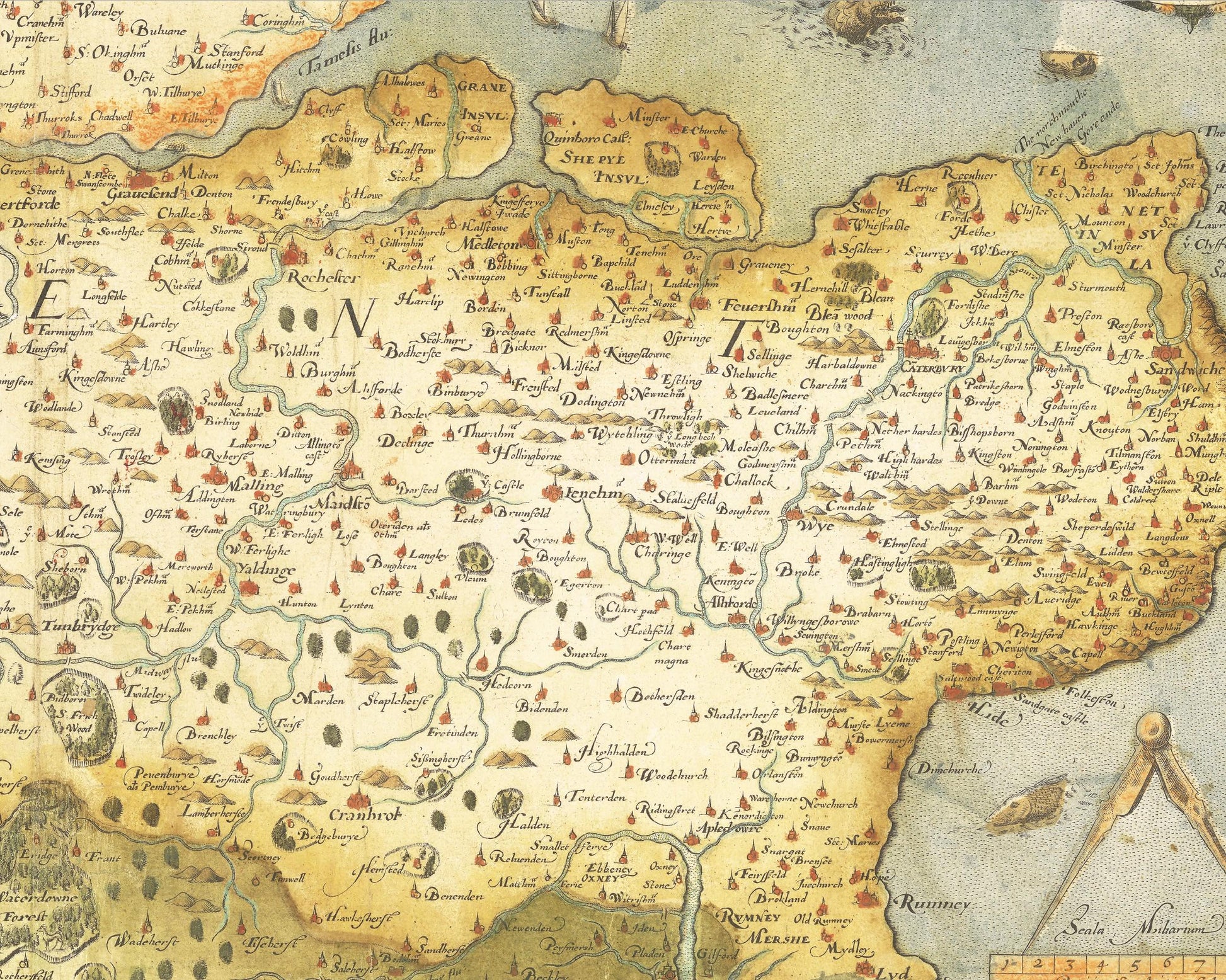 This is one of the earliest and most important English maps, covering the Southeastern part of England and dissected by the Thames River, with London prominently located near the top centre of the map. Embellished with sailing ships, sea monsters and an elaborate strapwork cartouche and scale of miles, it is among the most important 16th Century English maps.