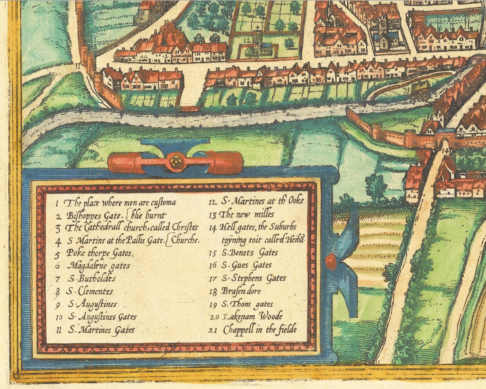 This fine view of Norwich is based on William Cuningham's plan of 1558. Viewed from the northwest its situation on a bend in the River Wensum is shown surrounded by verdant farms and pastures. The Norman Cathedral of the Holy and Undivided Trinity is at the heart of the city and to the right, on top of a small hill, is the castle.