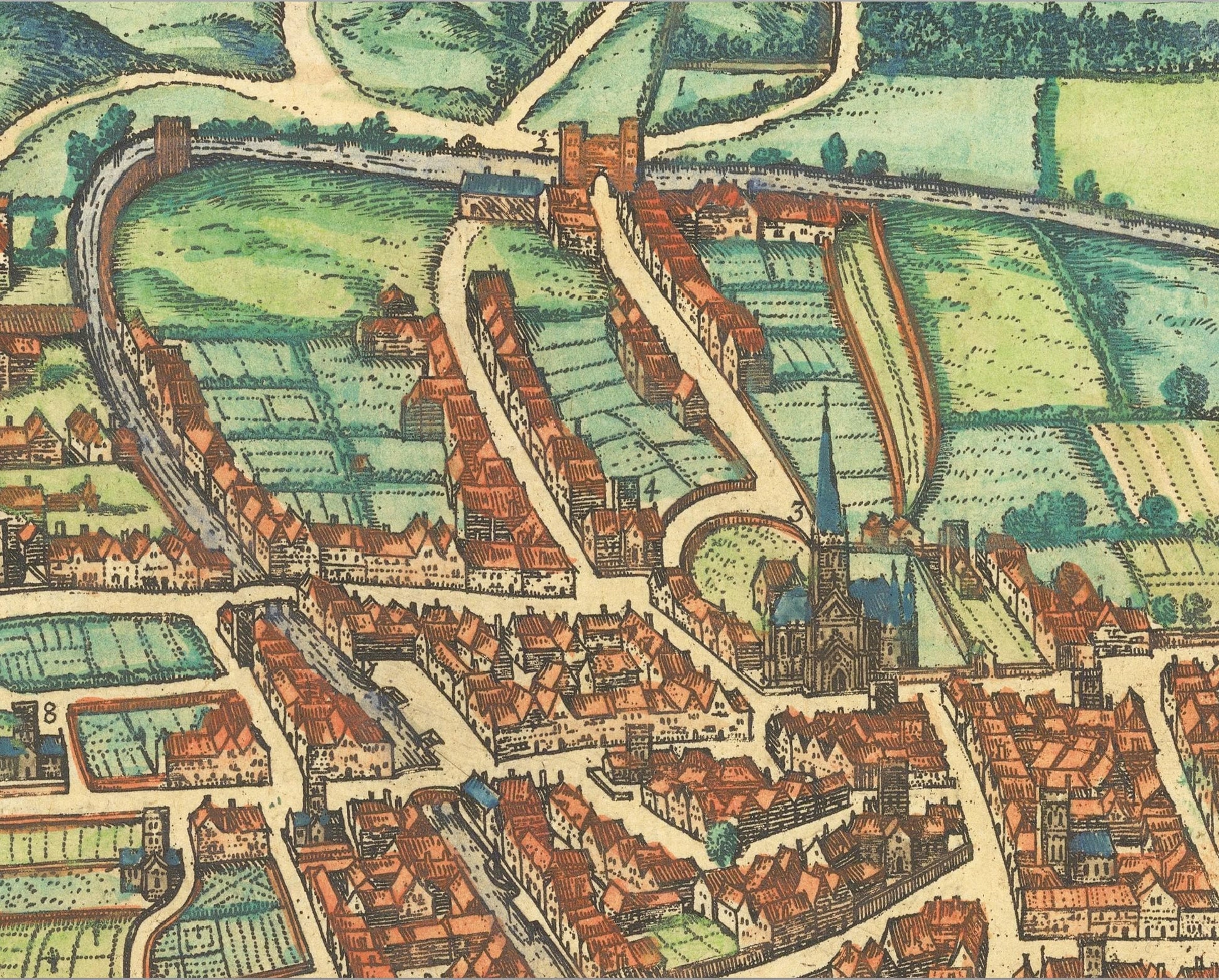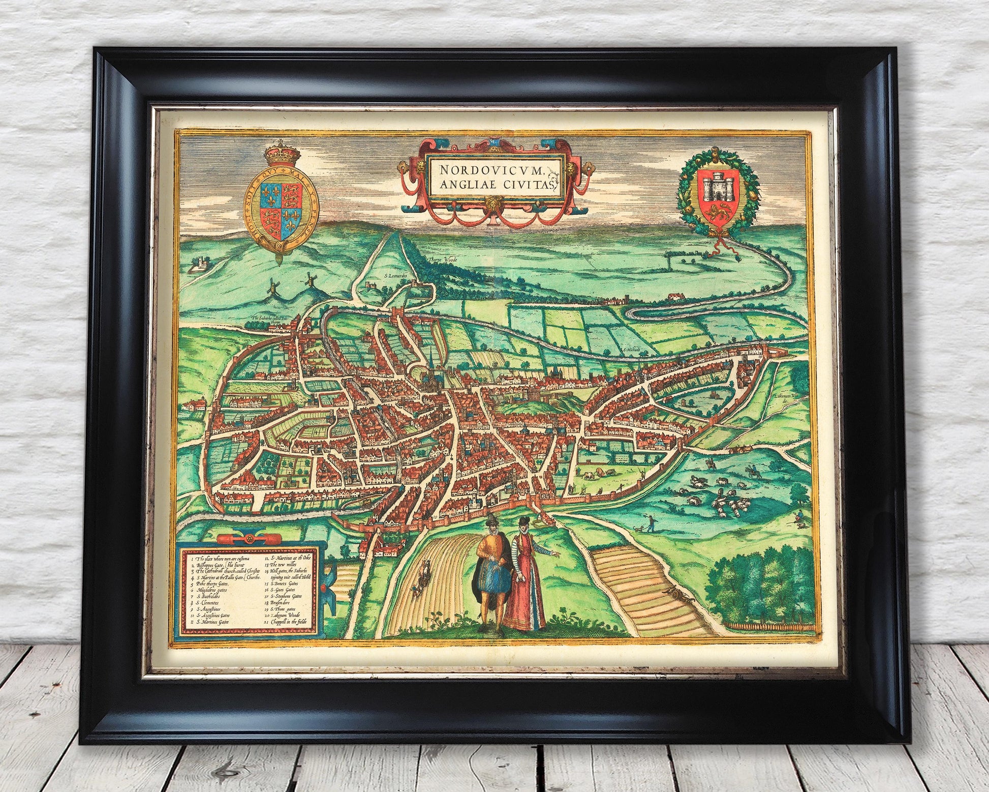 Published in 1575 by Georg Braun and Frans Hogenberg, this is one of the first printed maps of Norwich - or Nordovicum as it was known then. This map was first published in Civitates Orbis Terrarum - the Cities of the World - which was a cartographical masterpiece featuring 546 maps.