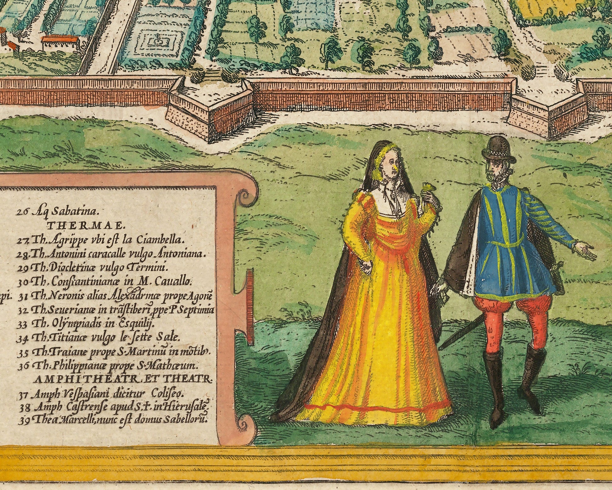 This beautiful hand coloured map of Old Rome was created by Georg Braun and Frans Hogenberg in 1572. Taken from the masterful Civitates Orbis Terrarum this work shows Rome from around 1550 and how it would have appeared should Shakespeare have visited. Rome is shown surrounded by city walls and within are contained the Pantheon, the Colosseum, the Arch of Constantine, and the Forum Romanum. Taken from a bird's eye perspective the River Tiber can be seen flowing in a north to south path.