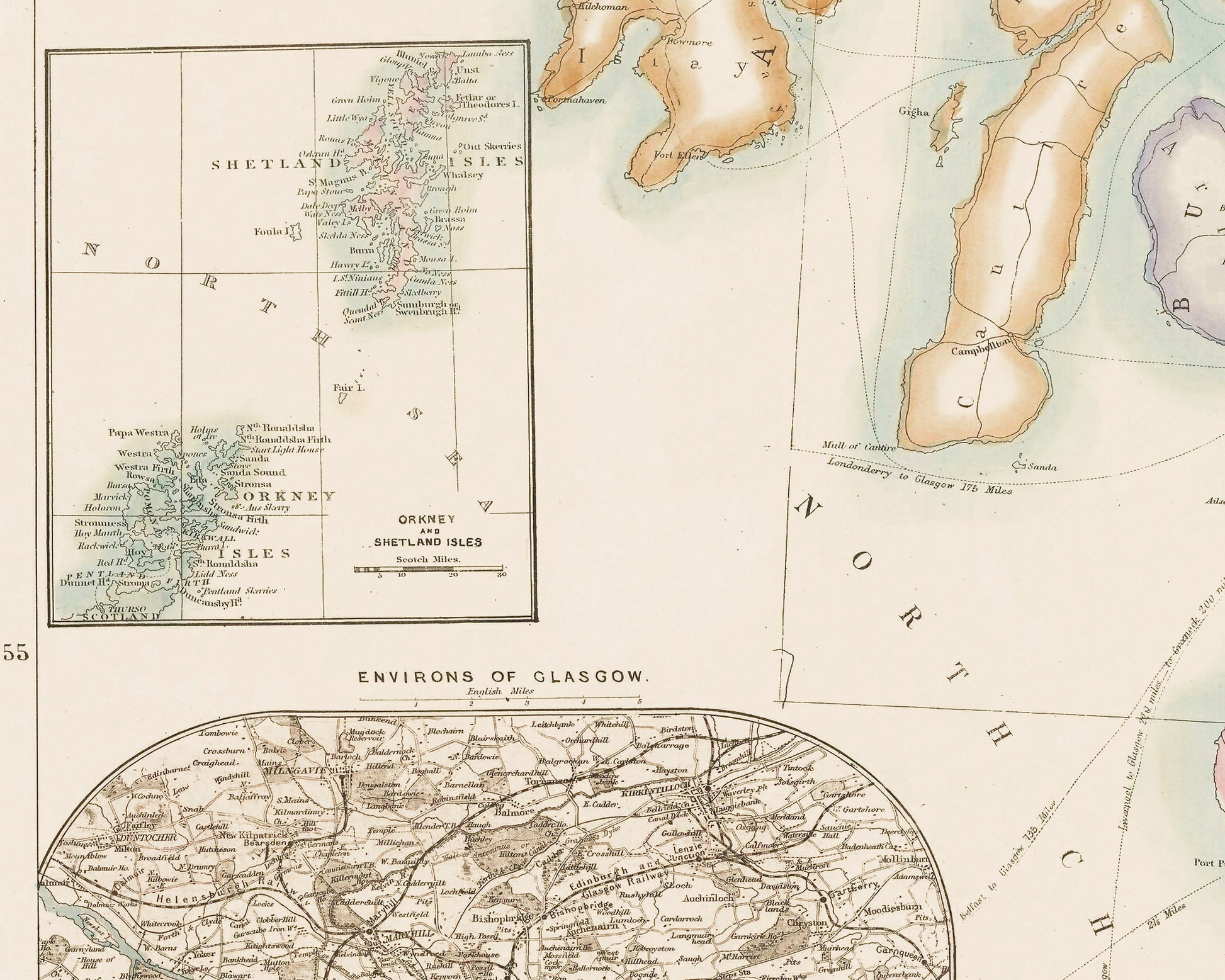 This particular map shows all the railways and stations in Scotland and also includes navigable rivers, canals and principal roads. Unfortunately the map in not dated but I believe it to be from the last quarter of the nineteenth century. The map features the Inner and Outer Hebrides as well as Orkney and the Shetland Isles. There are two inset maps showings the environs of Glasgow and Edinburgh.