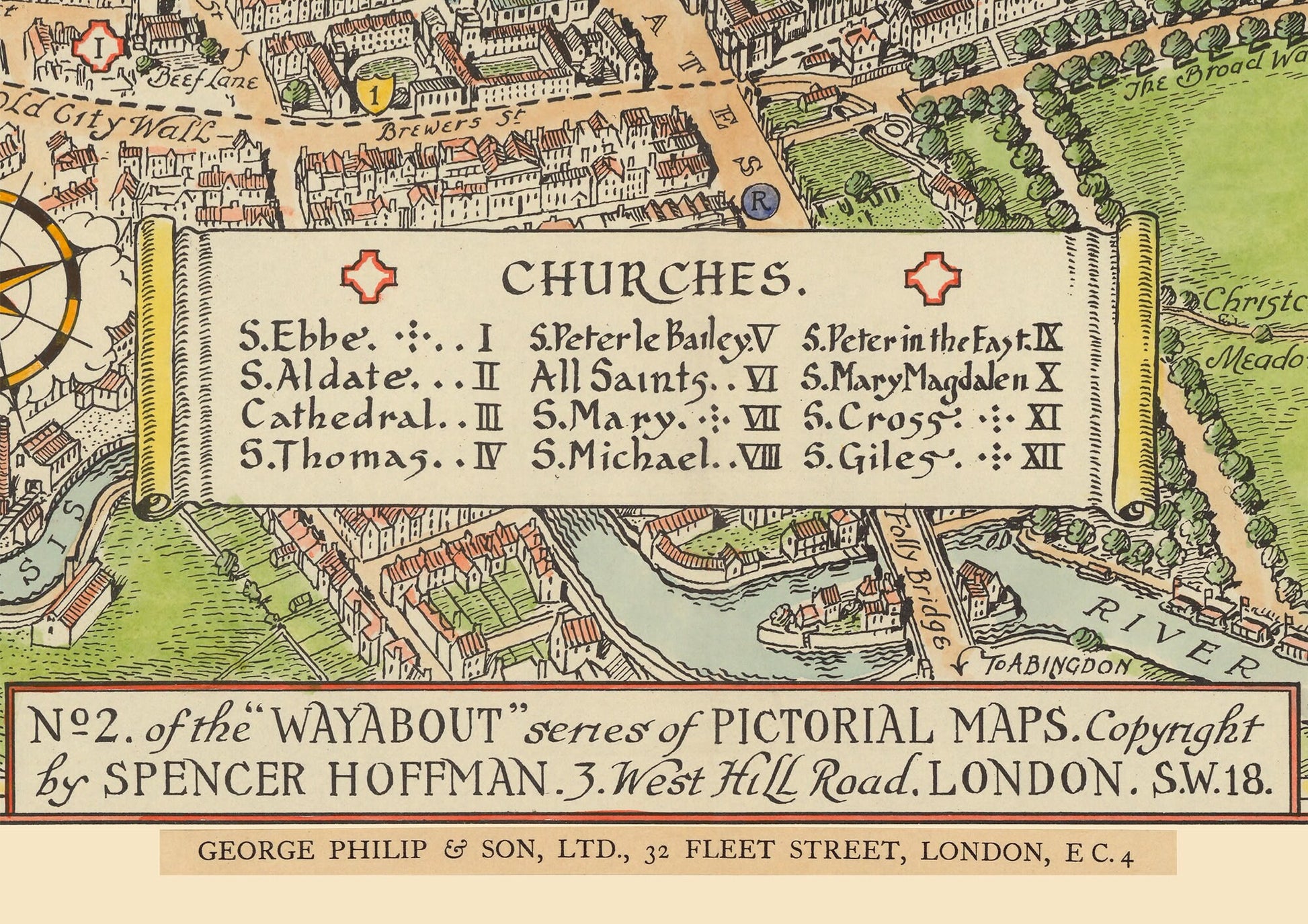 This charming map of Oxford (No 2 of Philips' "Wayabout" Series) was created by Spencer Hoffman in 1929 in a striking pictorial style.