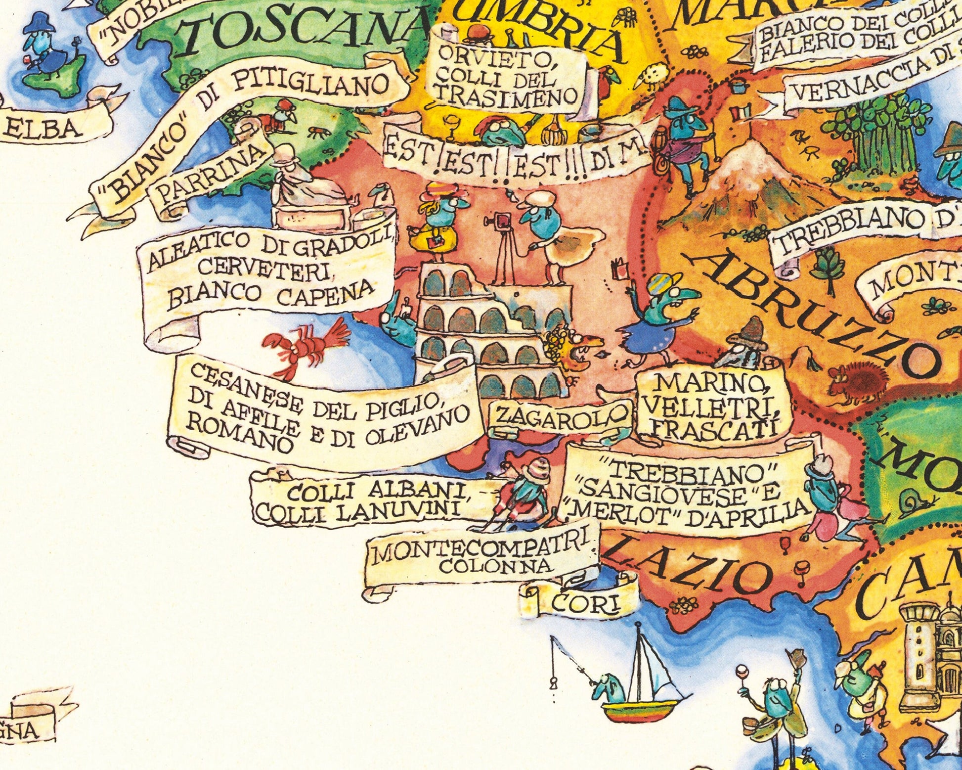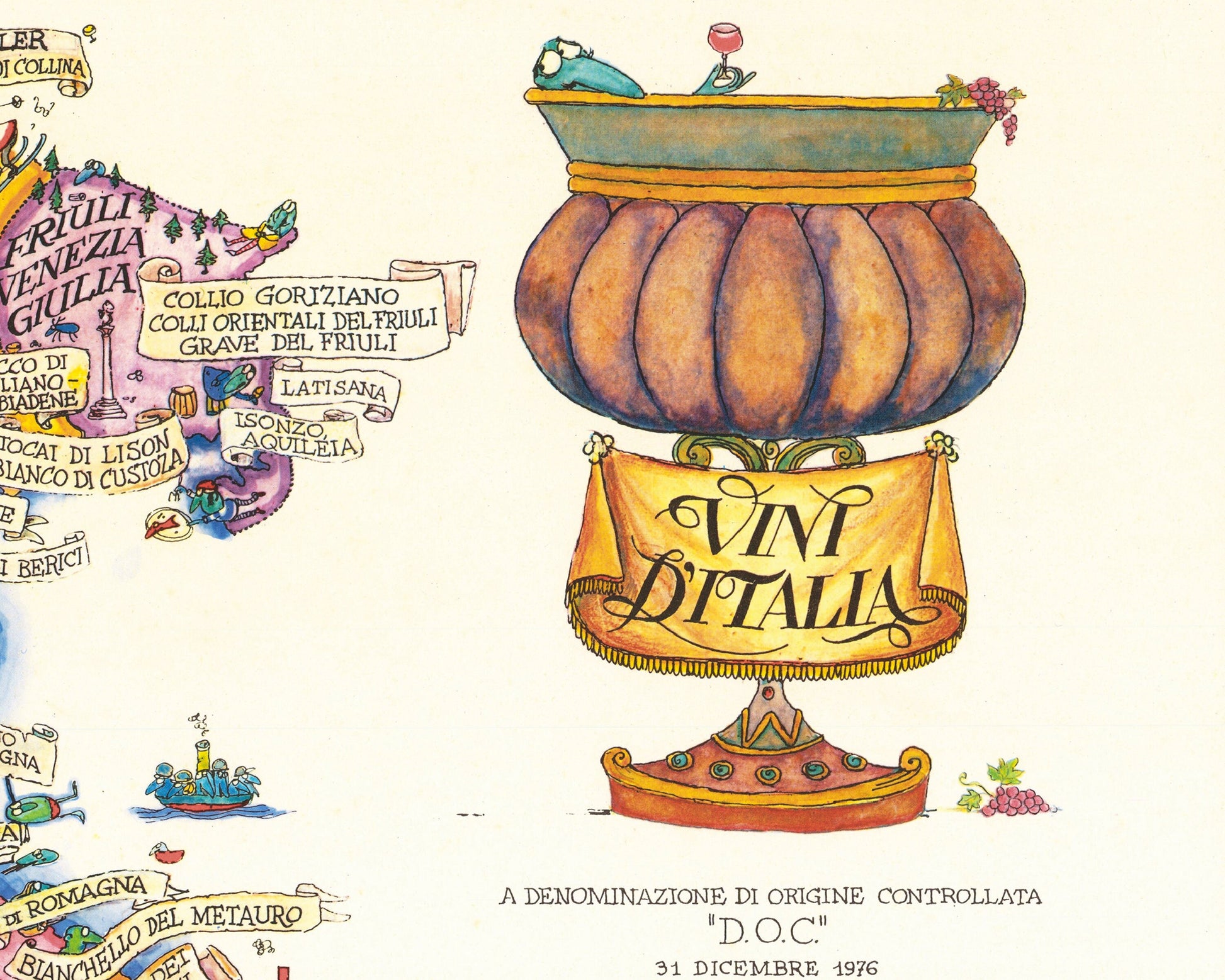 A more considered look tells you there is also a more serious story being portrayed. Commissioned by the Istituto Nazionale per il Commercio Estero (Italian Ministry of Foreign Trade) this pictorial map details over 300 DOC wines produced in Italy. The Denominazione di Origine Controllata is a mark of quality legislated in Italian law that growers must follow concerning grape varieties, colour and growing techniques in order to be gain this prestigious accolade.