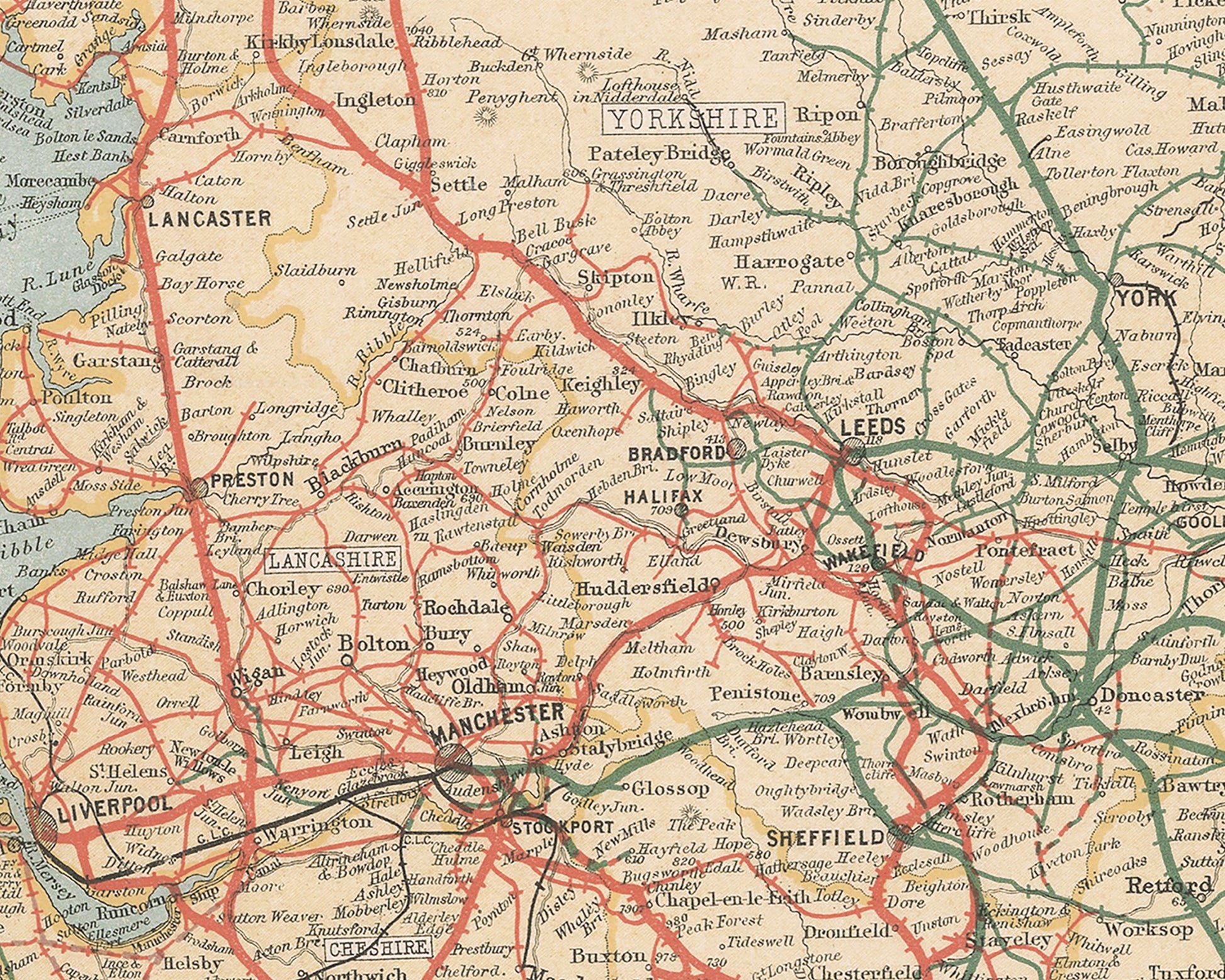 Our reworking of this superb map shows all railway lines within the British Isles and gives a great visual representation of which companies ran which lines and in which areas. There is an accompanying key. Also there is a fantastic zoomed in inset map of London and Suburbs network. Many sea routes are shown with the corresponding miles of the crossings noted.