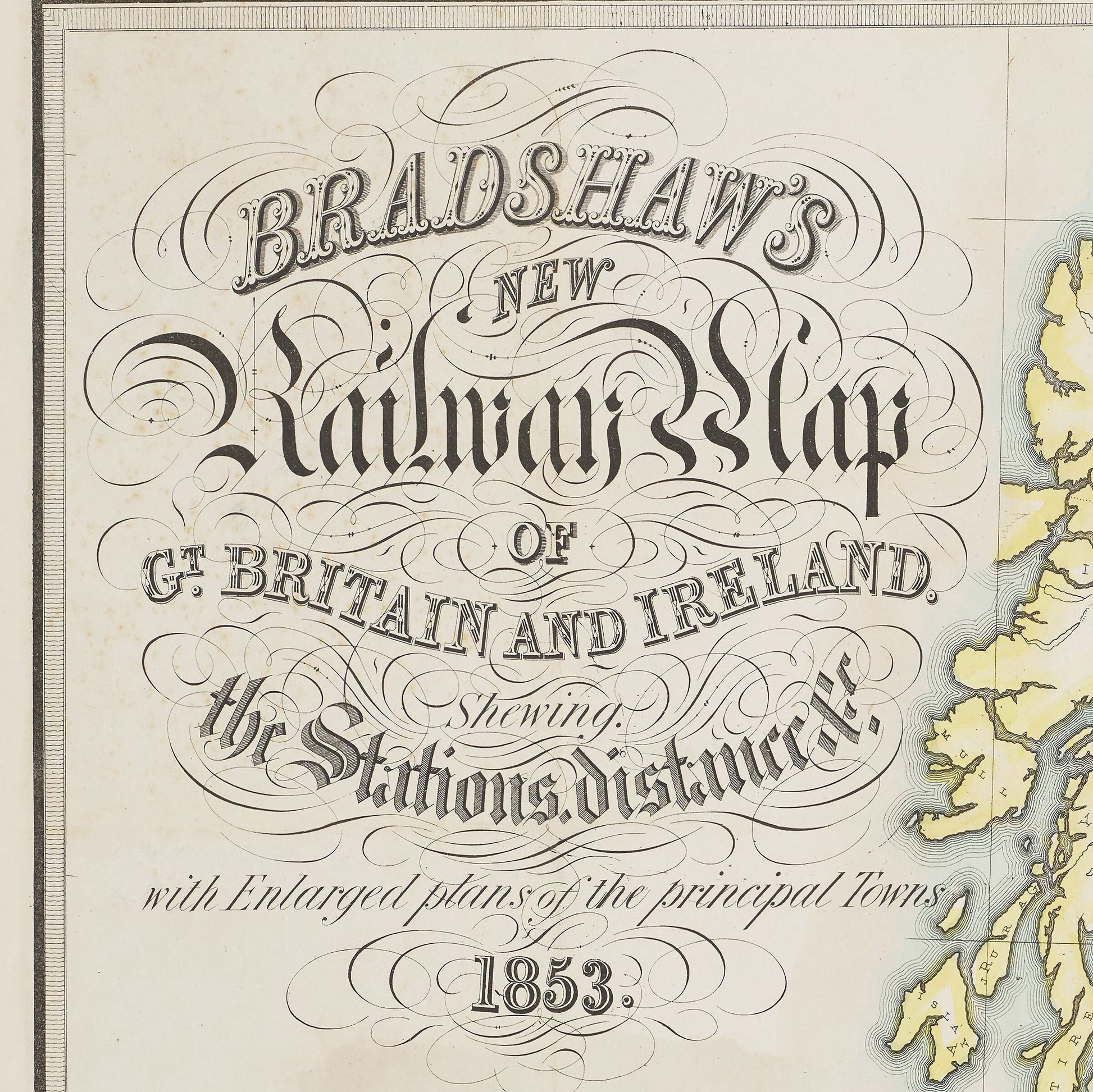 The name of George Bradshaw (1800-1853) is synonymous with the Great British Railway Journeys presented by Michael Portillo for it was Bradshaw who produced the early editions of Bradshaw's Guide, however Bradshaw was also a cartographer (mapmaker). To the railway hobbyist and aficionado Bradshaw's Railway Map represents the pinnacle of railway maps. The amount of detail crammed in to one map is quite staggering. The entire railway network of England, Ireland, Scotland and Wales as it stood in 1853 is comprehensively detailed - every line, every station. Mile markings from the capital cities are also shown - for English towns/cities miles from London, for Scottish towns/cities miles from Edinburgh etc. A total of 38 different lines are shown with a colour-coded key included. From ports mileage markers show the distances to various other destinations including New York and India. County and national borders are also delineated. Perhaps the crowning glory is the inclusion of 8 detailed mini-maps of town/city centres showing railway stations and track layouts - these include London, Edinburgh, Birmingham, Glasgow, Manchester, Leeds, Liverpool and Dublin. The final treasure is a wonderful calligraphic title of "Bradshaw's New Railways Map of Great Britain and Ireland shewing the stations distance with Enlarged plans of the principal Towns".