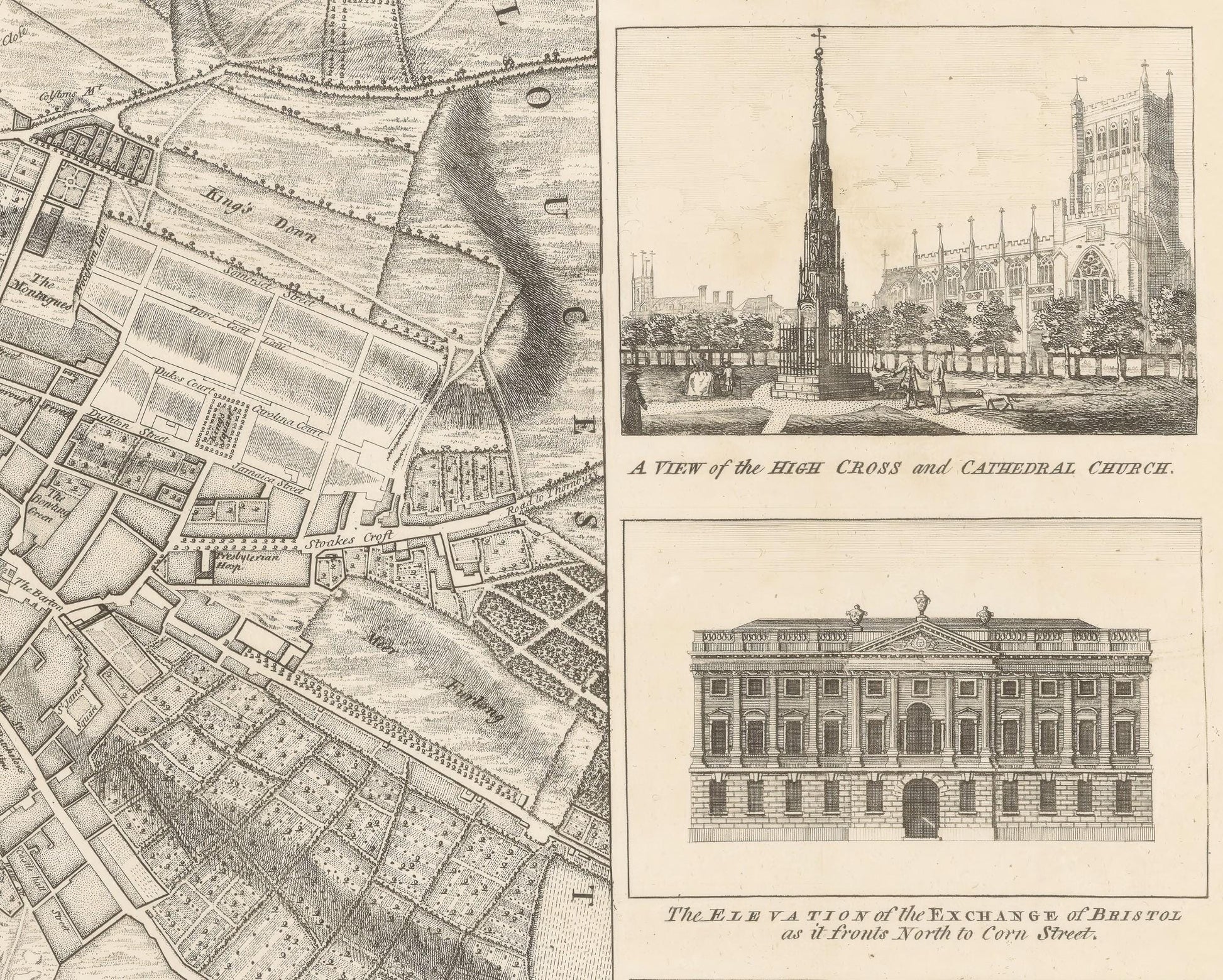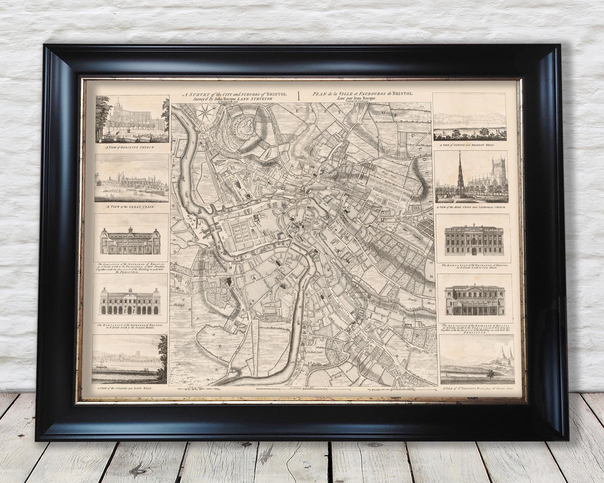Rare Old BRISTOL Map 1750 John Rocque - Clifton, Redcliffe, Cathedral