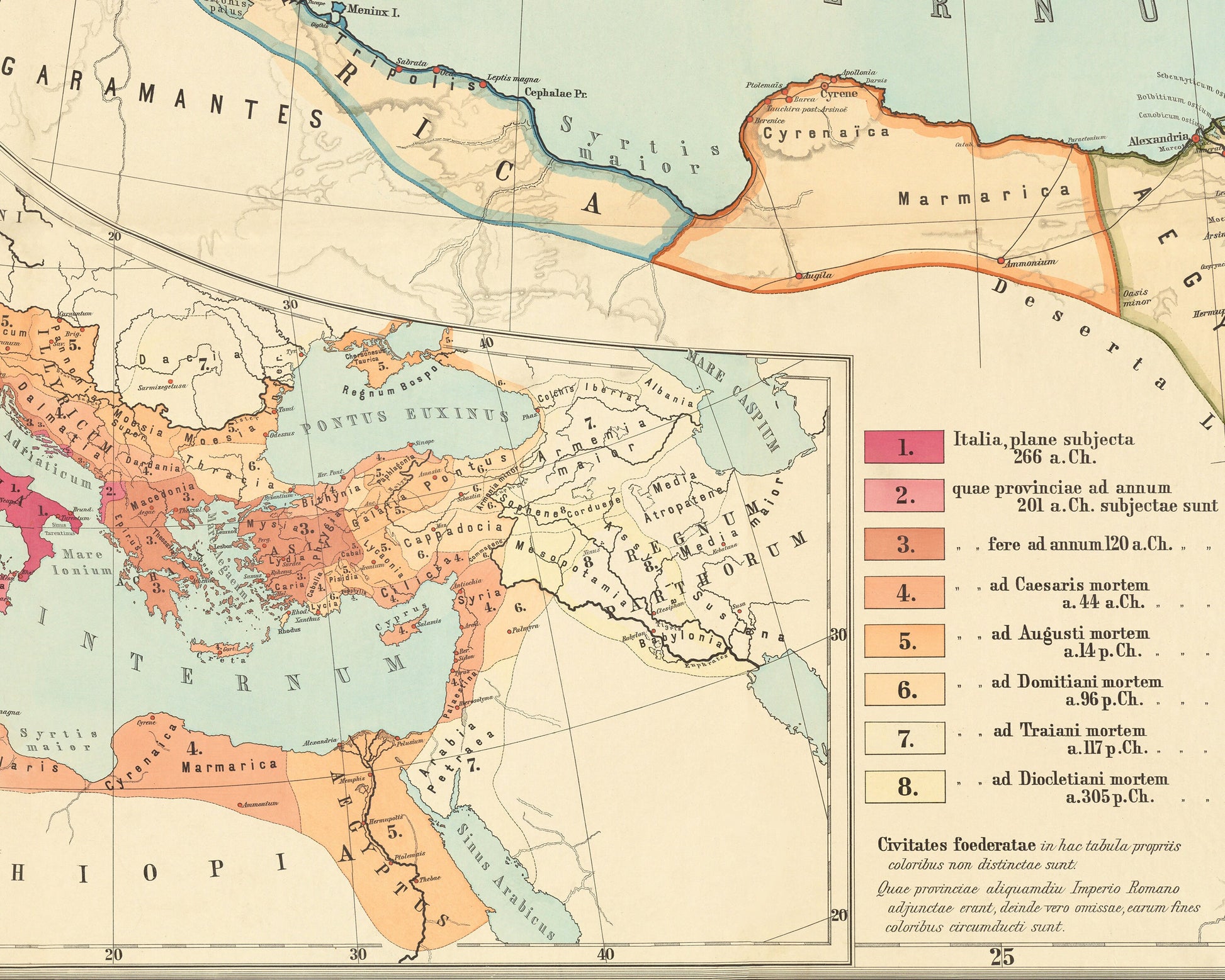 This exquisite map created by Albert Von Kampen charts over 500 years history from the fledging Roman Empire in 266 BCE until the close of Emperor Diocletian's reign in 305 CE. Truly one of the most powerful Empires of ancient times the Roman Empire encompassed much of modern day Europe and at its height included territories in Northern Africa and the lands of Meospotamia and Babylonia in Asia. It is commonly held that the Empire ruled over 55-65 million people at its peak - a quite remarkable feat.