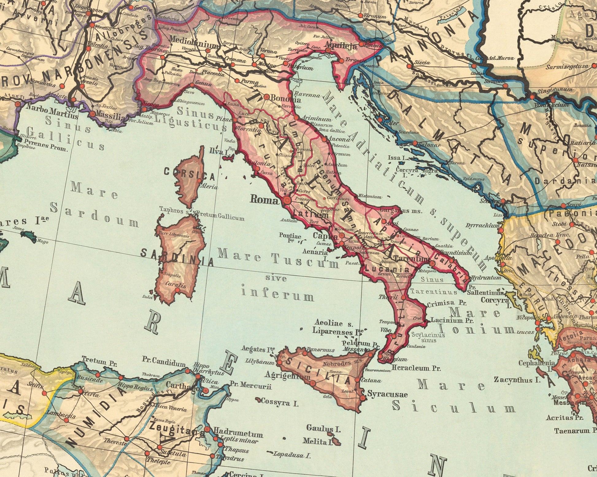 • A highly detailed map of the Roman Empire including major rivers, oceans, mountains ranges, settlements and roads from that time