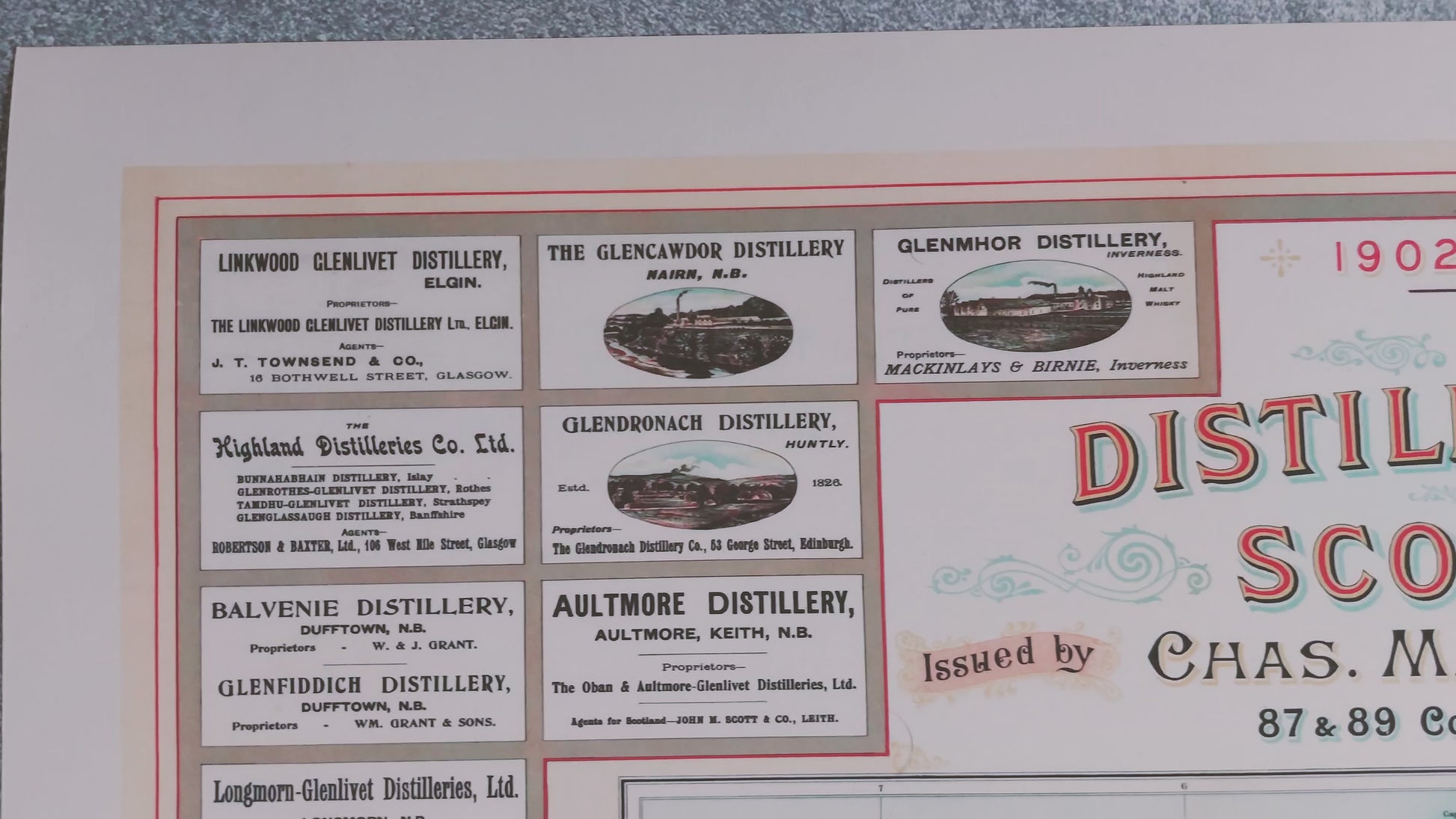 Around the border there are 66 advertisements by distilleries including famous names such as Glenmorangie, Glenfiddich and Laphroaig. Distilleries that have advertised are listed in red on the key.