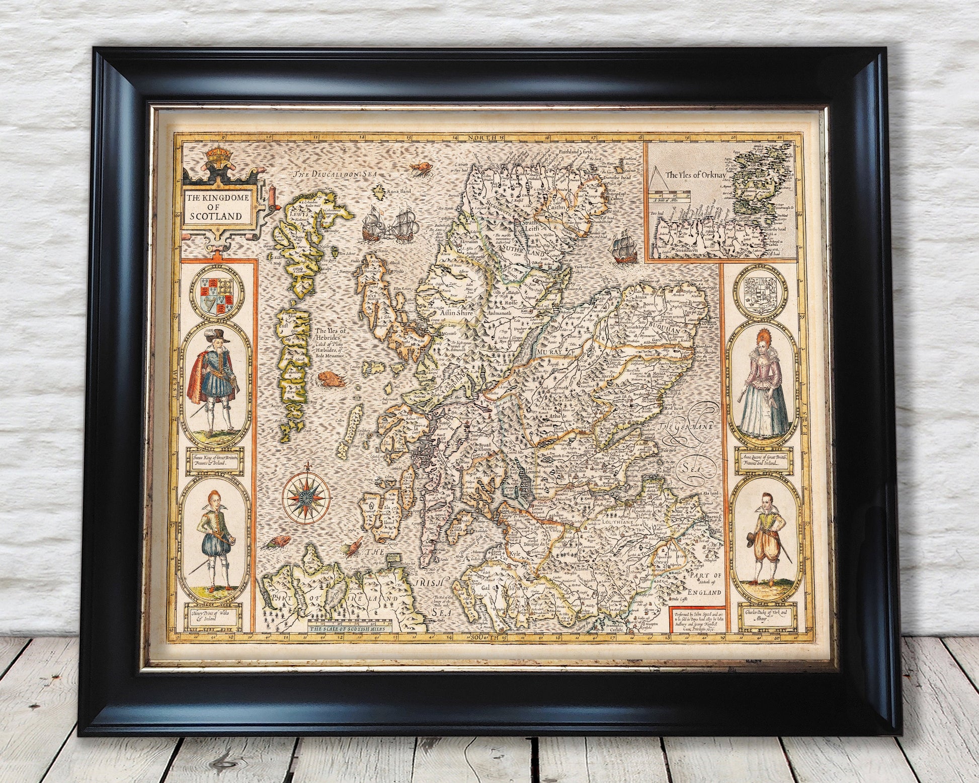 This classic piece was produced by John Speed the best known mapmaker of the Stuart period. This wonderful decorative map was produced over 400 years since. Unlike England, Wales and Ireland, Speed only produced one map of Scotland. This was because a fellow cartographer Timothy Pont had already begun surveying a comprehensive study of Scotland and thus Speed didn't want to duplicate such work. The map here shown is an antique reproduction of the original hand coloured map and therefore each original map is in itself unique.