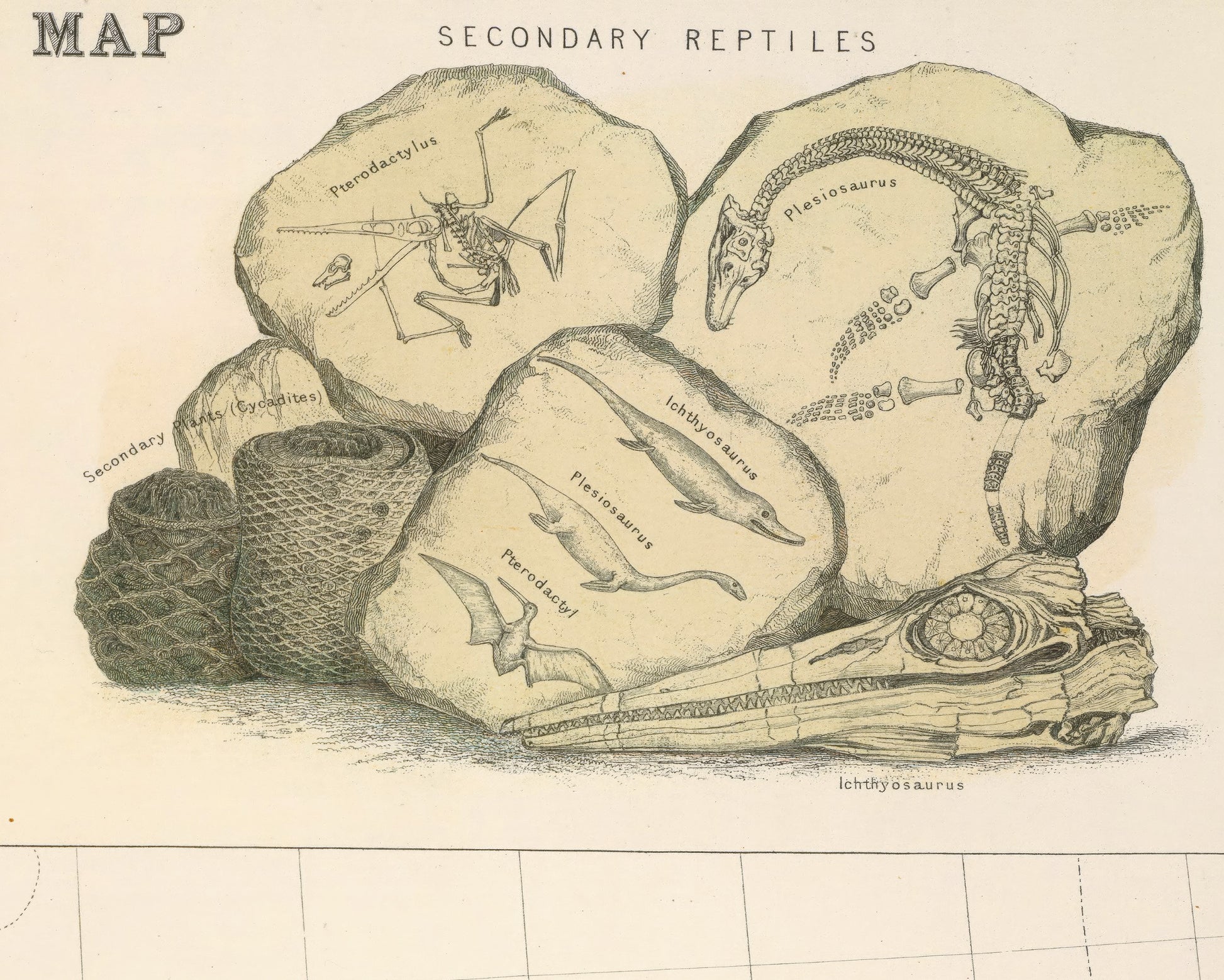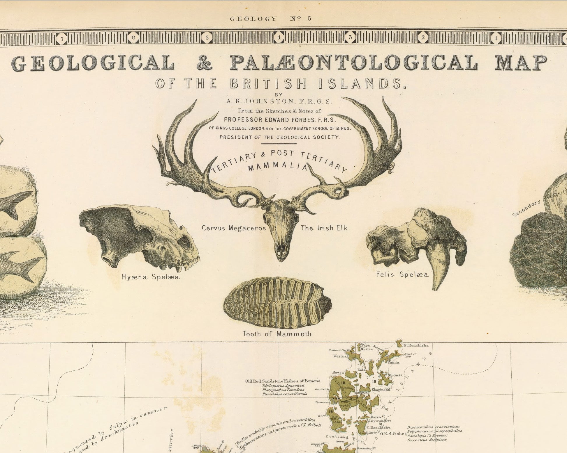 This fascinating, comprehensive and detailed map of Scotland published in 1854 was created by W and AK Johnston. It combines a geological chart detailing the different rocks and strata around this land along with a Palaeontological study of the creatures that once slithered around and swam in the oceans of Scotland.