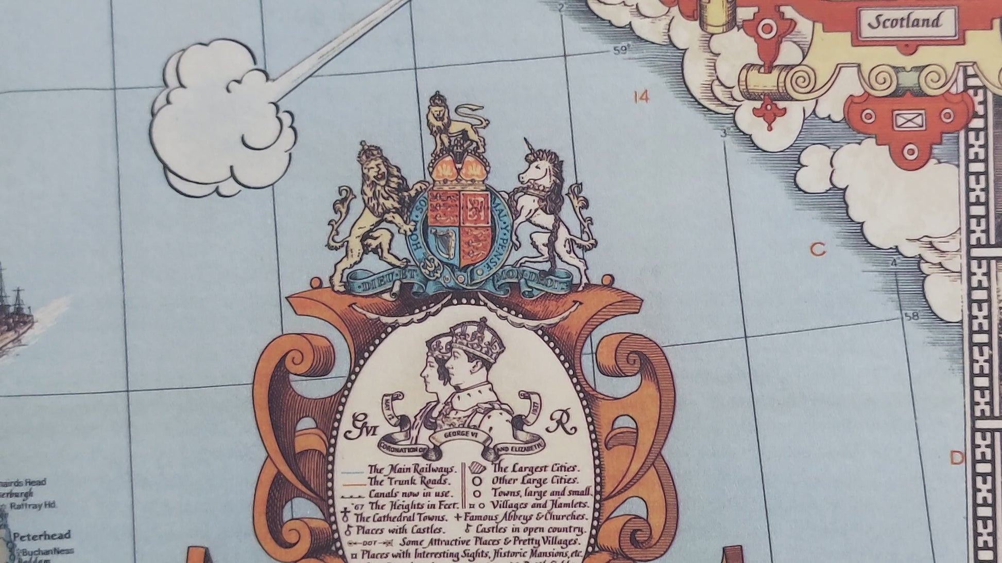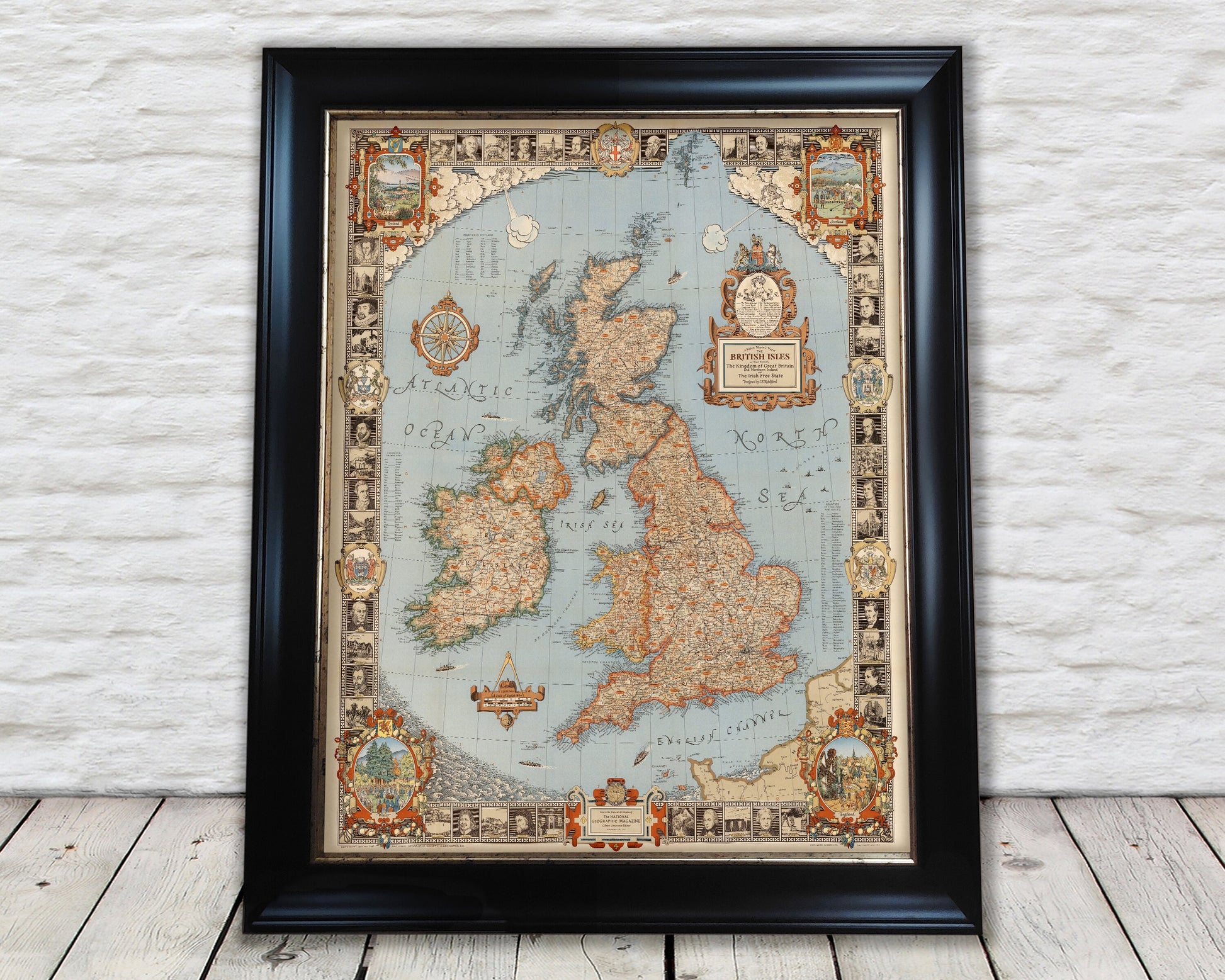 This map is an absolute masterpiece, it is packed with so much information, illustrations, history, geographically extensive and very pleasing to the eye. This superb work was created by CE Riddiford and commissioned by the National Geographic which they published in 1937. Where to start! Firstly there are beautiful vignettes in each corner featuring England, Ireland, Scotland and Wales in idyllic scenes. There are crests of the capital cities London, Edinburgh, Cardiff, Belfast and Dublin. There is a total of 44 mini illustrations around the border. Twenty one are of great and famous British and Irish people including Queen Victoria, Watt, Burns, Dickens, Nelson, Chaucer, Raleigh, Newton, Shakespeare and Darwin to mention a few. The remaining 23 illustrations are made up of famous places: The Potteries, Greenwich, Canterbury, Downing Street, St Andrews, Edinburgh, Killarney, Blarney etc... one of Cricket and of course one for tea!! A Fantastic map of the five countries featuring main railways, trunk roads, canals, race courses, cathedral towns , castles, county and country borders and towns and cities.