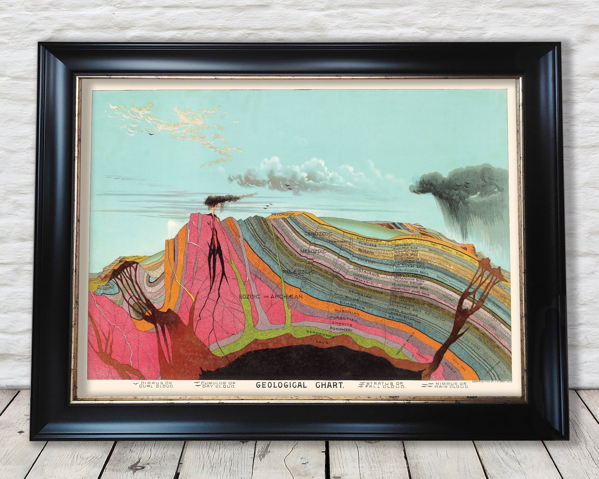 Yaggy's large geographical charts are among the most beautiful and impressive educational charts published in the 19th century. Using chromolithography, Yaggy created stunning colours and contrasts in his images of the world, its regions, and peoples. This Geological Chart was one of 10 such geographical works. This superbly illustrated and coloured chart delineates the four main geological time periods being Cenozoic, Mesozoic, Palaeozoic and Eozoic. Theses time periods are further subdivided into epochs such as Cambrian, Jurassic, Triassic and Quaternary.