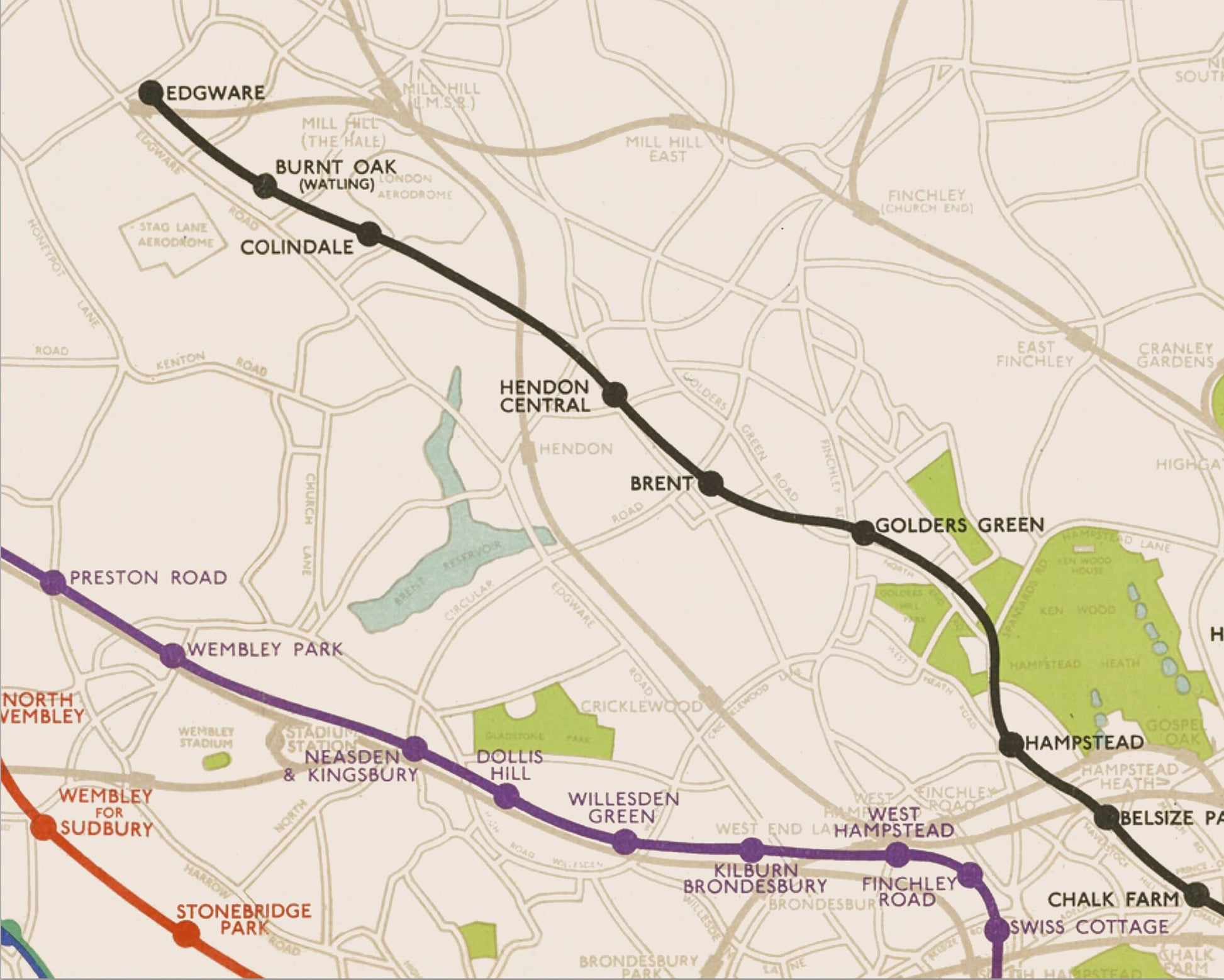 This superb map of the London Underground was created by FH Stingemore a trained draughtsman who joined the Underground Group in around 1919. He produced his first edition of his tube map in 1925 and produced various updated iterations as lines and stations were added. His early maps didn't place the network in context to its geographical surroundings. This edition 1932 edition however places the lines and stations into the landscape, you can see the various parks, roads and the overland railways (in muted grey) thus making it easier to orientate oneself rather than viewing an abstract network. I like this approach and believe it looks more visually appealing. However the following year saw Henry Beck publish the first of his Tube network diagrams which was to become the de facto standard from which the modern day Underground map is derived.