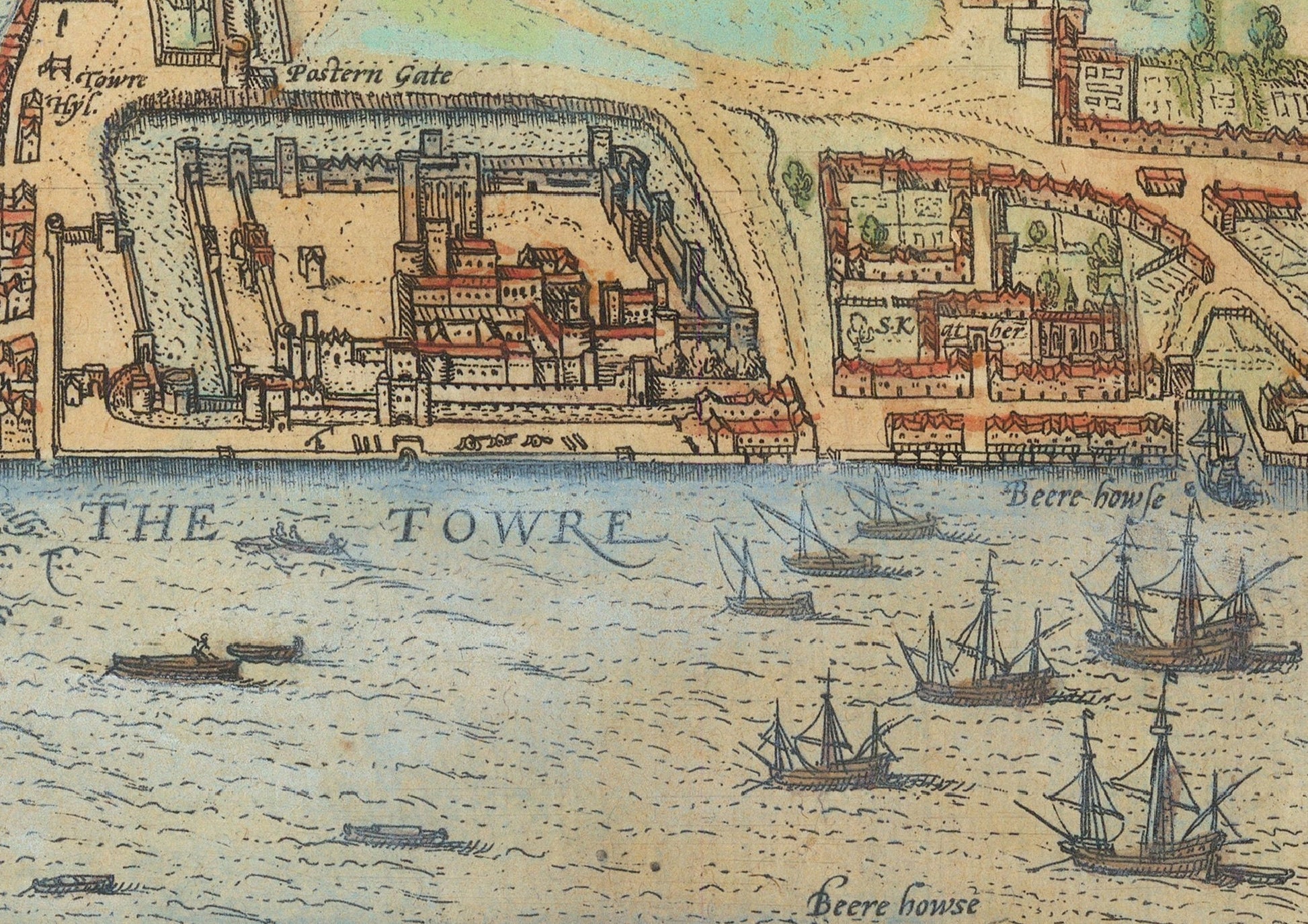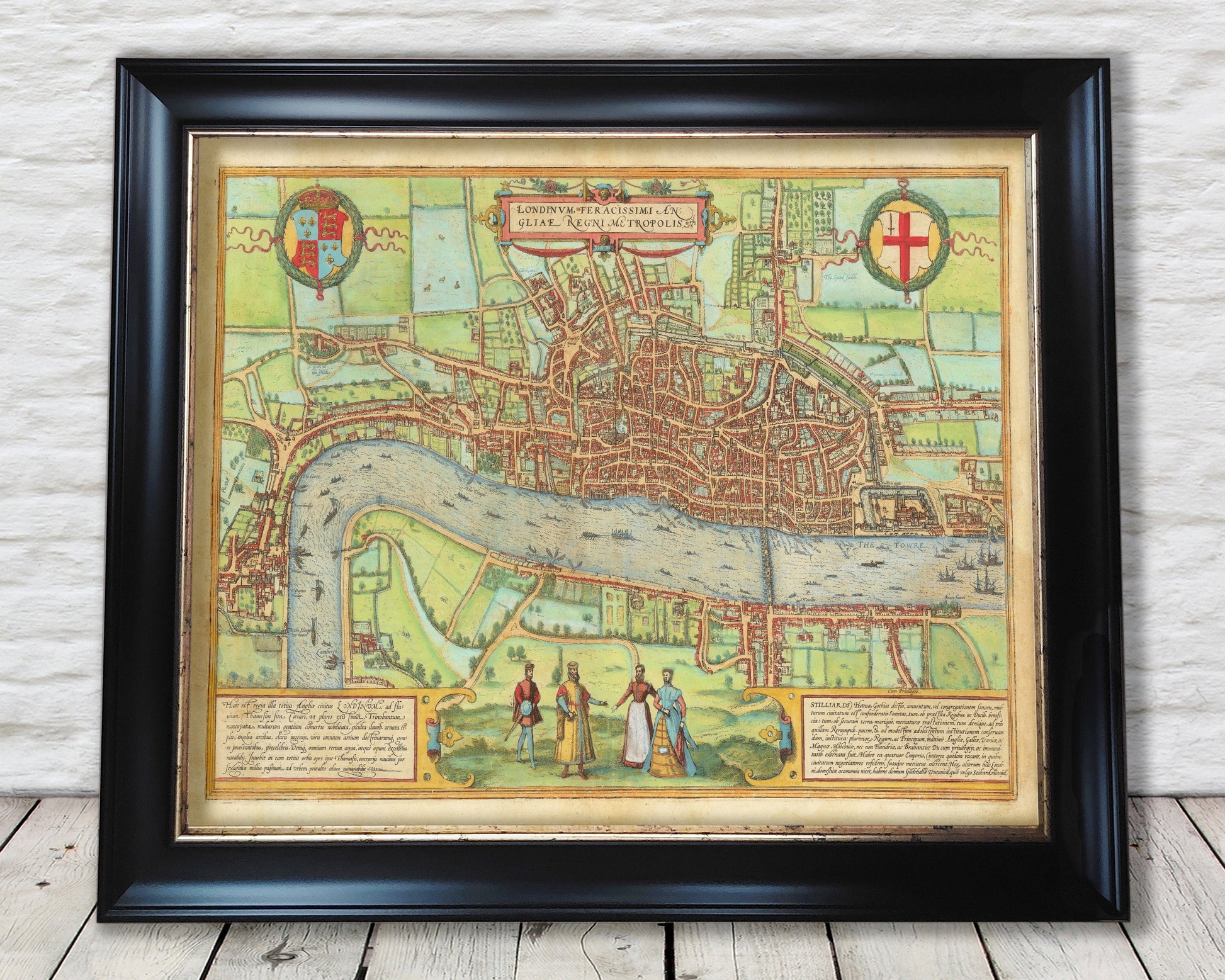 This superbly crafted map by Georg Braun & Frans Hogenberg was painted in 1572 during the midst of the Elizabethan Era. Widely believed to be the first true map of London this is a classic and historically significant work on many different levels. This map pre-dates the Great Fire of London (1666) in which 400 streets were consumed therefore making this an important record of how London looked before that cataclysmic event. In 1572 London was much smaller than its current incarnation yet still had around 200,000 inhabitants. The walls which surround the "Square Mile" can be viewed in their entirety bounding from the River Fleet all the way round to the Towre (Tower of London). Numerous gates in the walls are evident including Ludgate, Newgate, Cripil Gate (Cripple Gate) and Allgate (Aldgate). All life is depicted too from "entertainment" on the south bank of Beare bayting and Bowll bayting, the bustling Thames the commercial lifeblood of London, sites of executions, the notorious Bethlem Asylum, the importance of religion with over 120 churches and the extent of grandiose buildings which marked London's pre-eminence in commerce and position as the nation's capital. This is London as Shakespeare would have known it.
