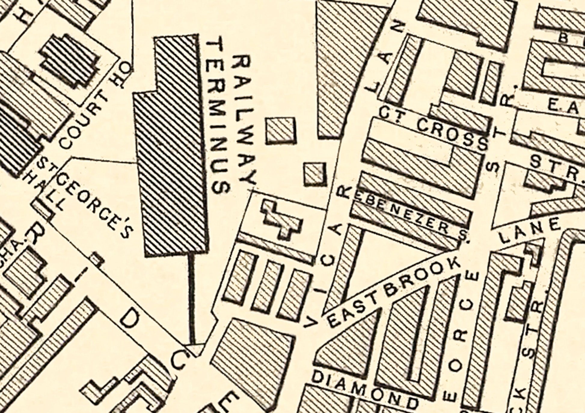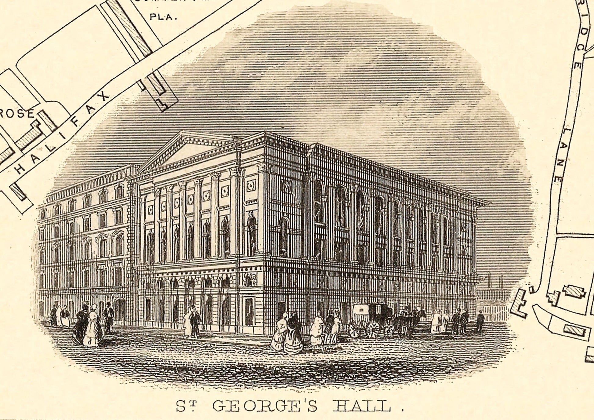This striking piece was created by the renowned artisan and engraver John Rapkin. This 1851 work pre-dates the building of the current town hall completed in 1873 and was before Bradford gained its city status in 1897. It features two railway stations. Drake Street station was completed in 1850 (later to be called Bradford Exchange) on the York & Lancashire Railway with services towards Halifax and beyond. The Leeds & Bradford Railway terminated at Kirkgate in Bradford and was the first station opening in 1846.