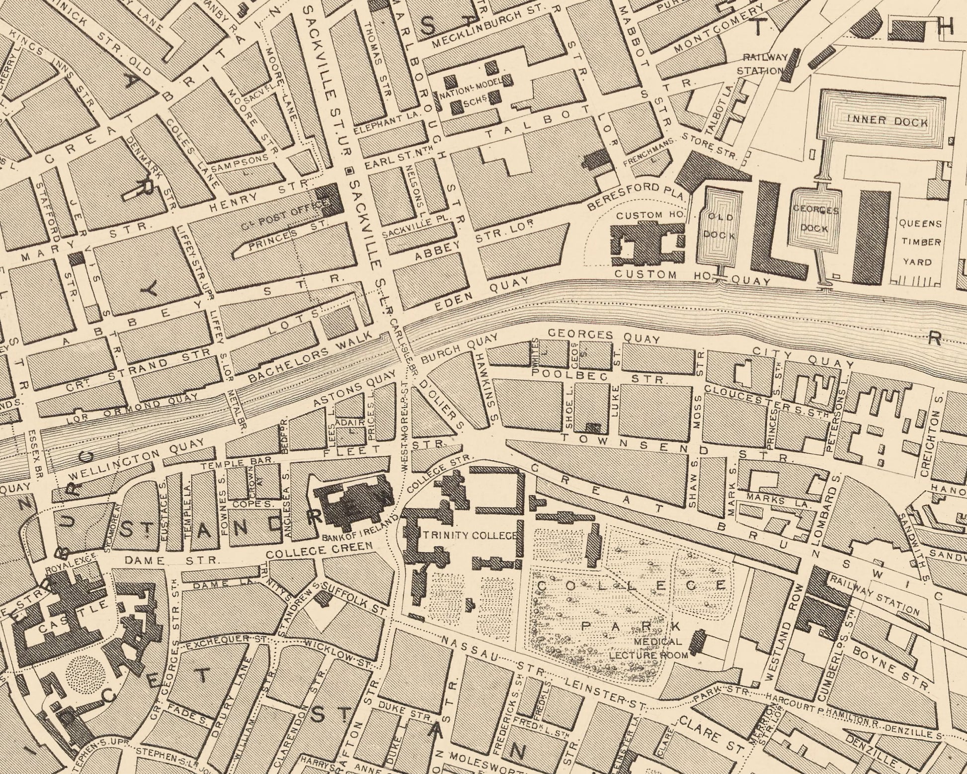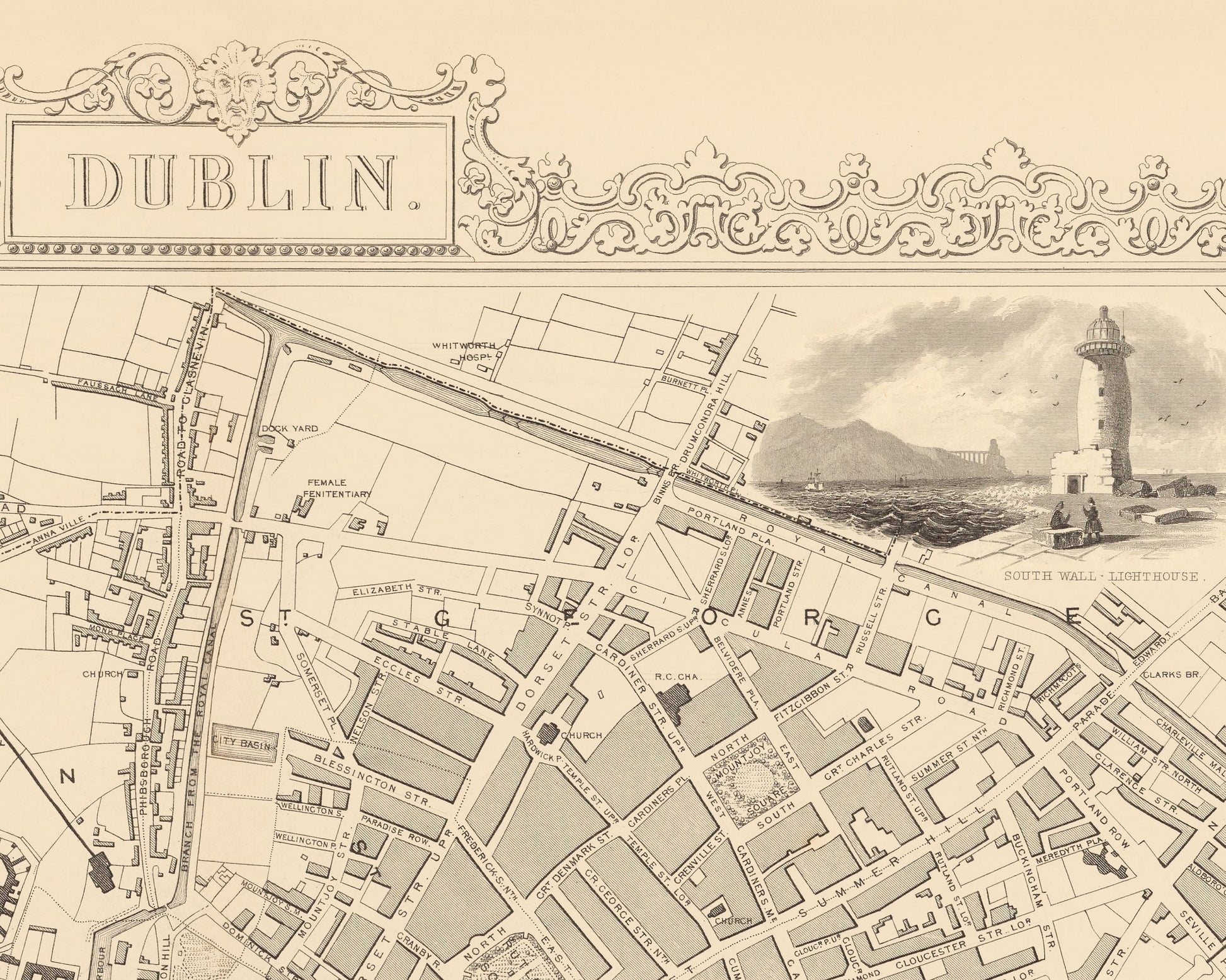 This wonderfully detailed 1851 map created by John Tallis shows the vibrant city of Dublin. Situated on the banks of the River Liffey, Dublin was an administrative centre adorned with beautiful architecture and of course St Patrick's Cathedral. The Industrial Revolution didn't take hold as much in the south of Ireland and the pace was a little slower but the Guinness brewery, St James Gate (est 1759) and the Jameson Distillery, Bow St (est 1780) were significant employers in the 1850s. Put your feet up and take an imaginary stroll through historic Dublin's fair city!