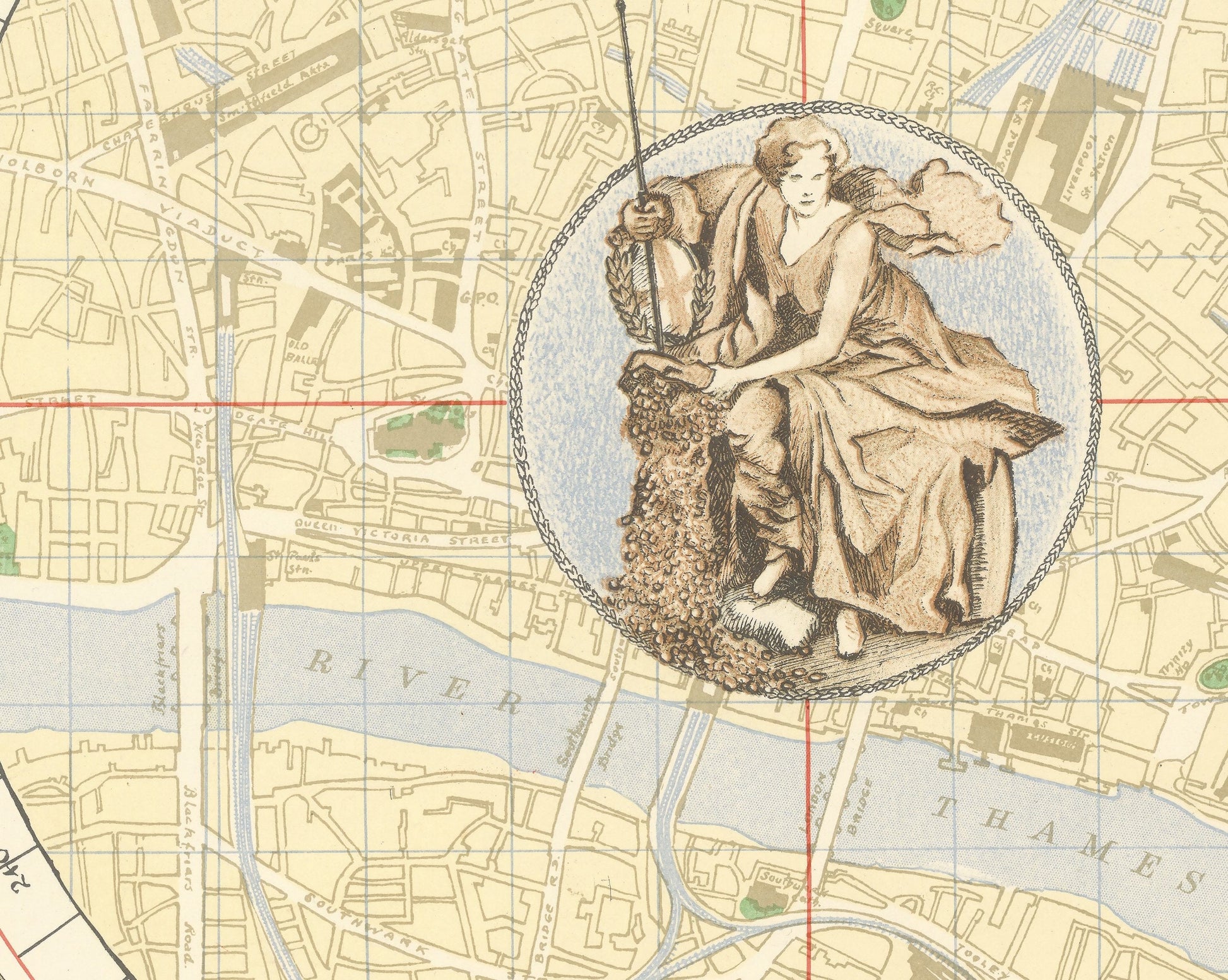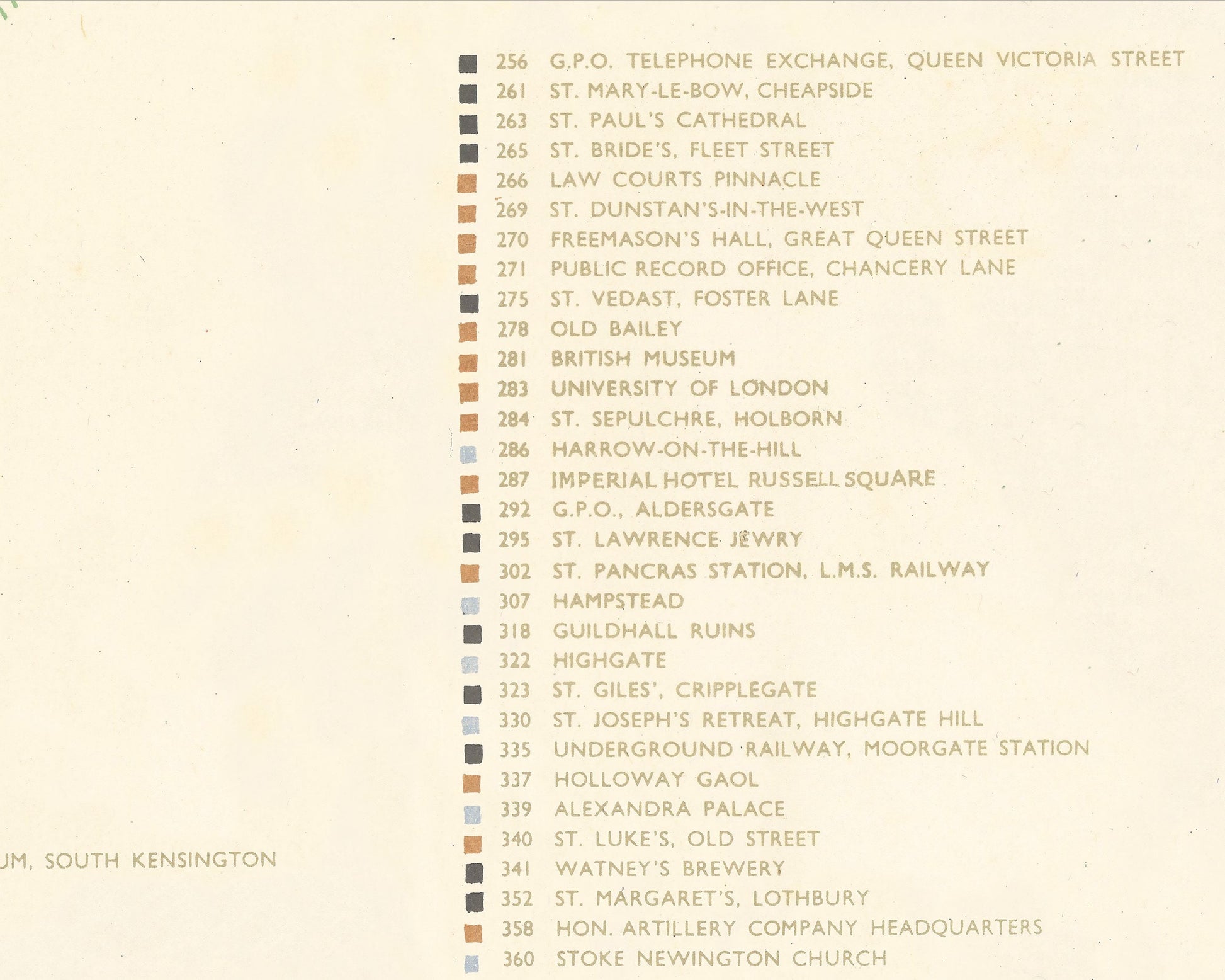 This is a reproduction of a rare and attractive map that was drawn by a member of the bank staff, Arthur Bond, which he originally prepared to serve as a “Roofspotters’ Guide” during the time of the flying bomb menace. It would appear that the bank produced a small number, possibly 500 copies only, for presentation to employees and others.
