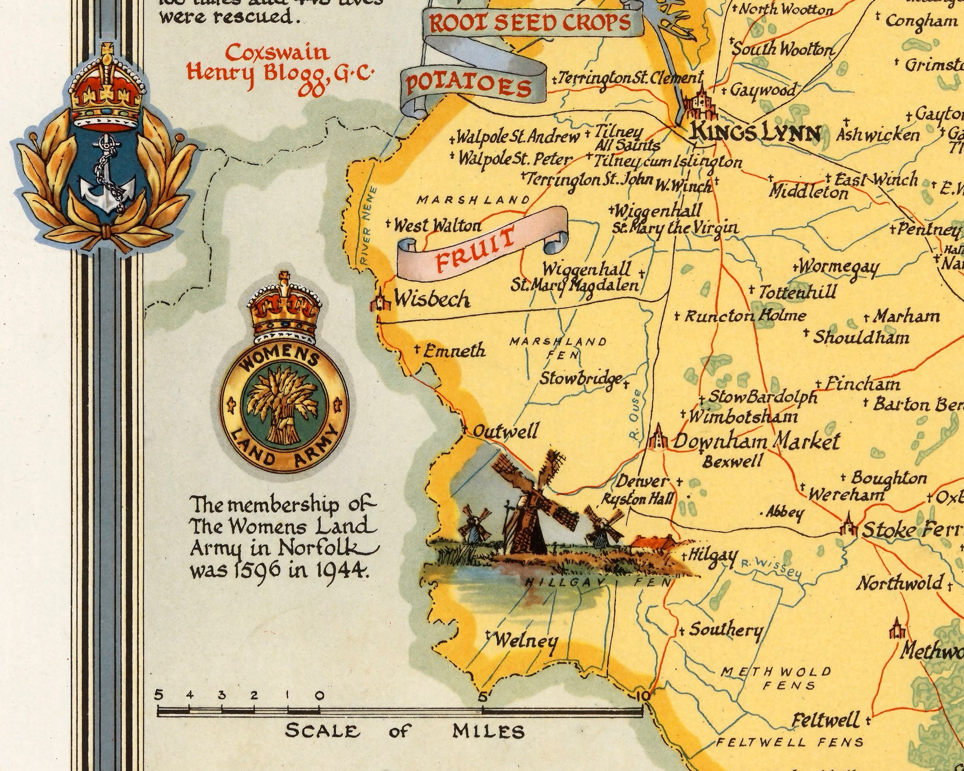 Drawn by Ernest Clegg this superb pictorial map of Norfolk was completed just after World War Two and shows Norfolk's contribution to the war effort. Norfolk was a key producer of vital foods stuffs during the war with crops such as barley, sugar beet, wheat and fruit as Britain thwarted the German blockade. Indeed Norfolk had the highest arable acreage of any county during the war. Women played a key role in agriculture by joining the Women's Land Army whilst the men were away fighting. Over 100,000 acres were also given over for airbases for the RAF and USAF.