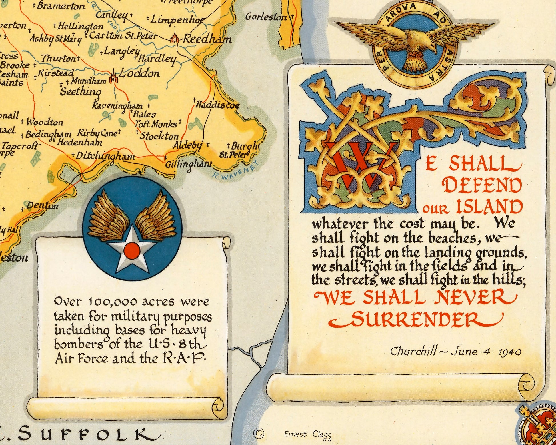 The map is surrounded by numerous vignettes of the City of Norwich, Sandringham, crest of Kings Lynn and others. An extract from Churchill's most famous World War Two speech is also quoted "We shall fight them on the beaches..." This is a true piece of history captured in map form.