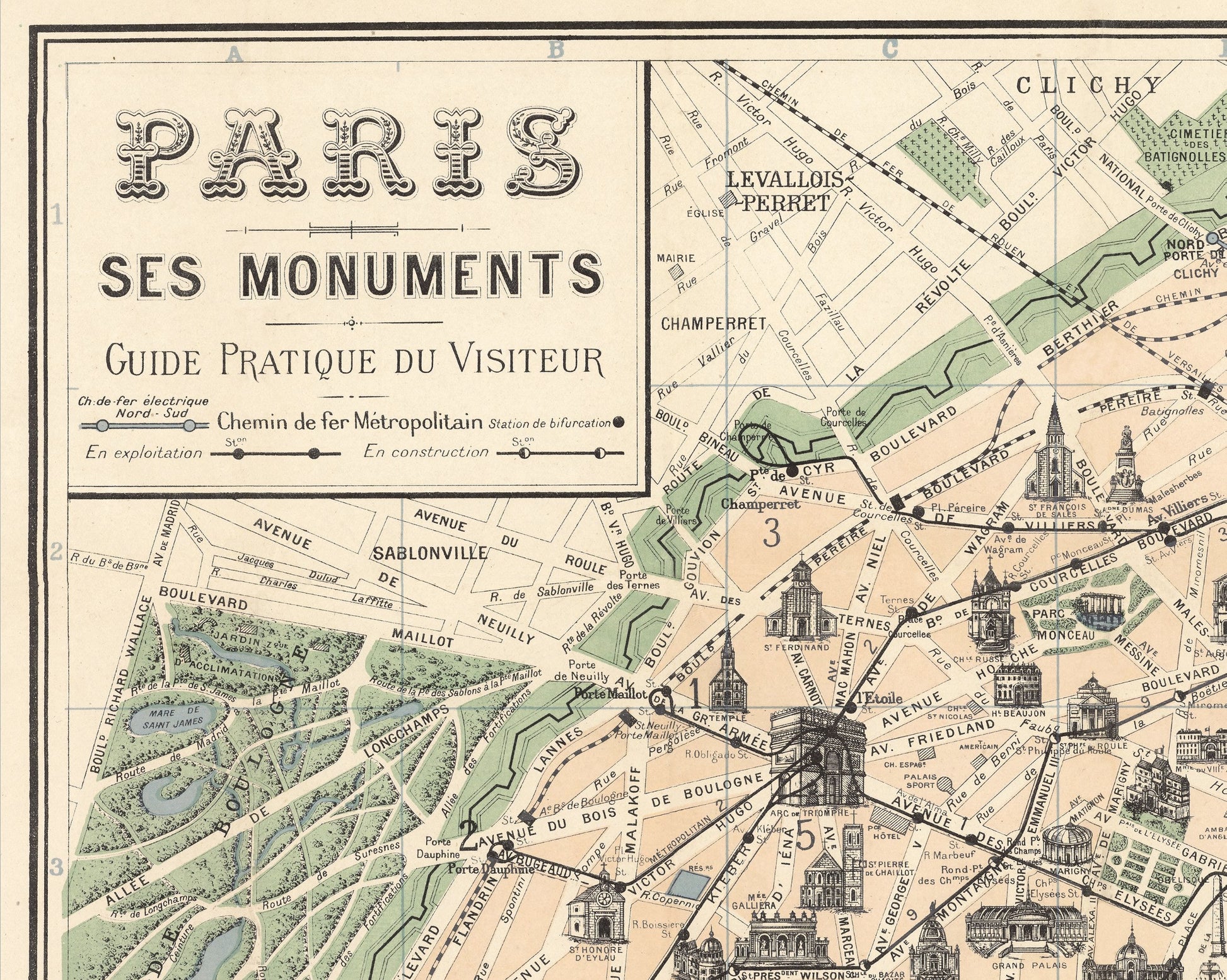 This is an attractive 1924 pictorial tourist pocket map of Paris, France by F. Borremans. The map depicts the city of Paris from Bois de Boulogne to Bagnolet and the Bois de Vincennes and from Porte de la Villette to the Park Montsouris. Parisian landmarks, including the Louvre Notre-Dame, the Arce de Triomphe, the Eiffel Tower, and the Opéra, are all illustrated in profile, as are numerous others. Parks, are coloured green, allowing them to stand out as the oases of urban life that they are. Myriad roads are also labelled, and the city's Metro lines crisscross their way throughout the city, allowing Parisians easy access from one side of the City of Light to the other.