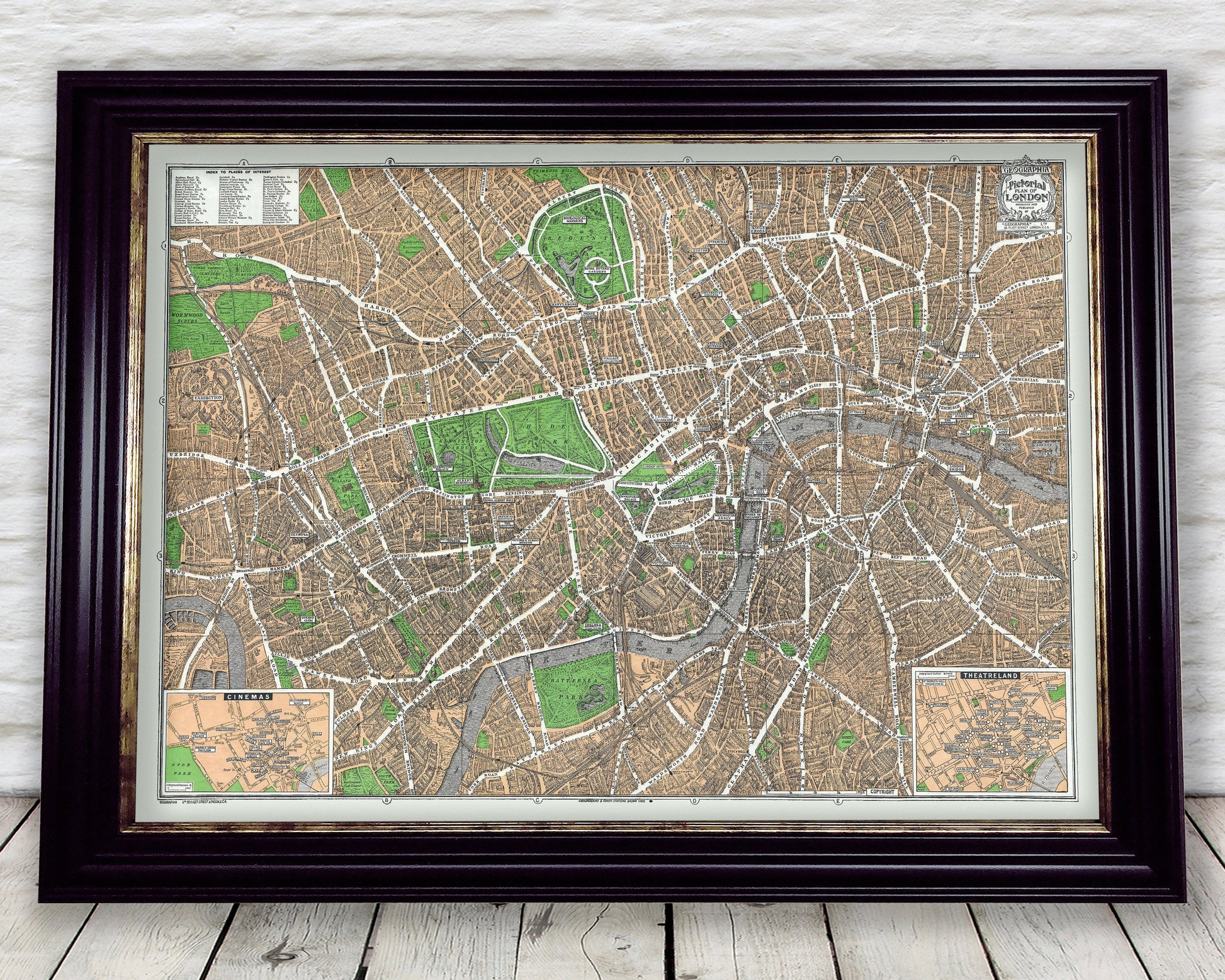 Wonderful PICTORIAL plan of LONDON 1933 - inset cinema and theatre maps